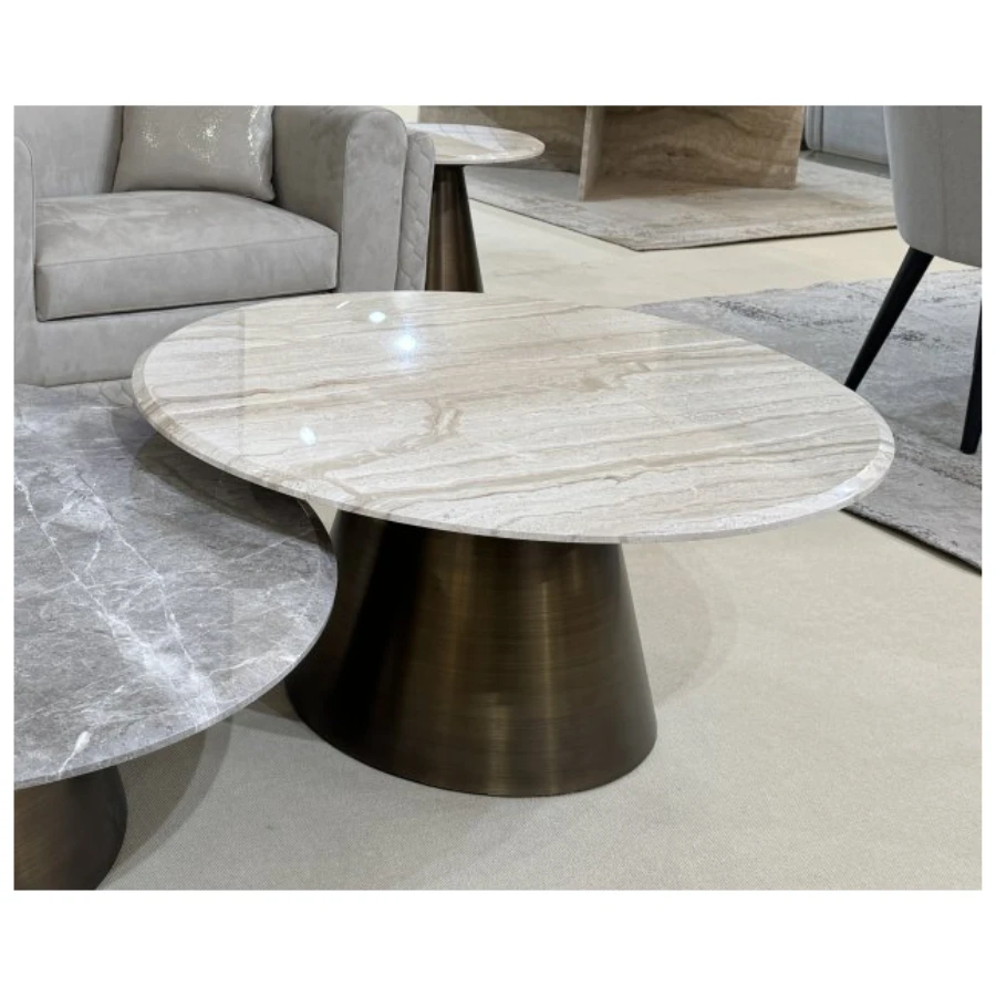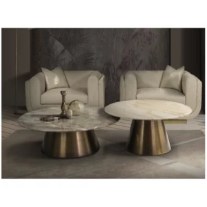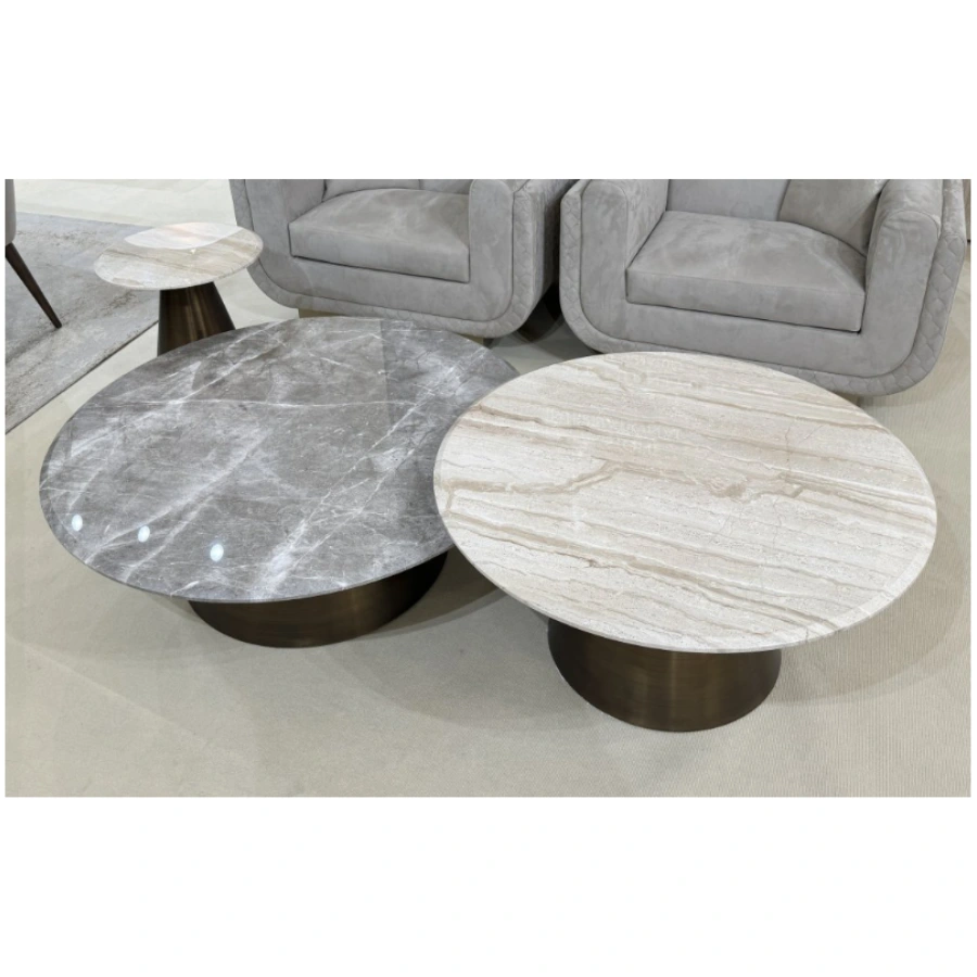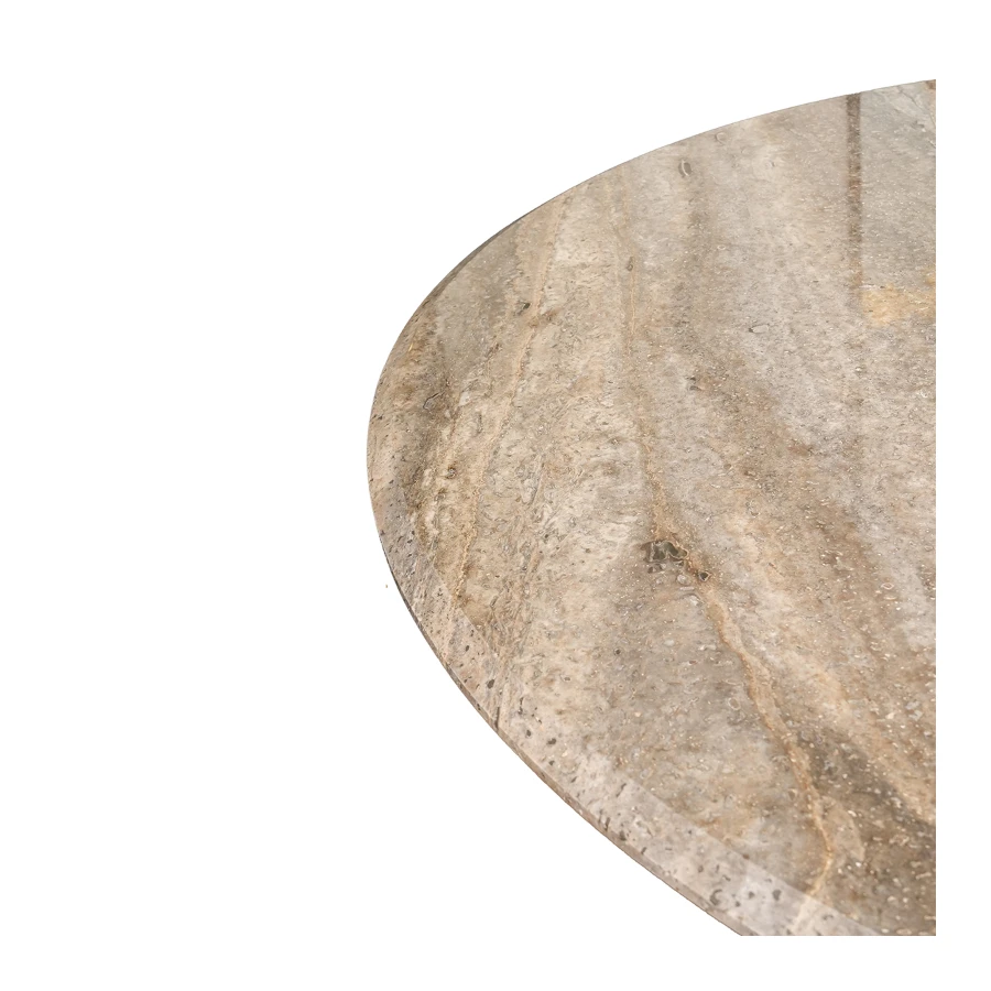 The Malibu Coffee Table features a round top crafted from Glam Travertine, a unique Italian stone known for its sandy beige background, soft veining, and subtle bronzed inclusions.