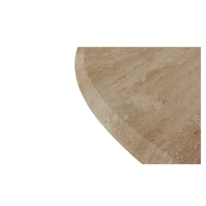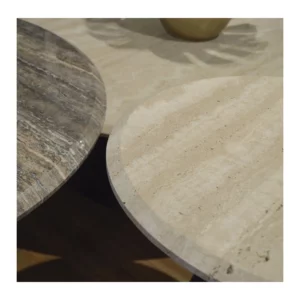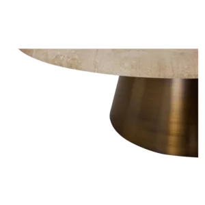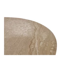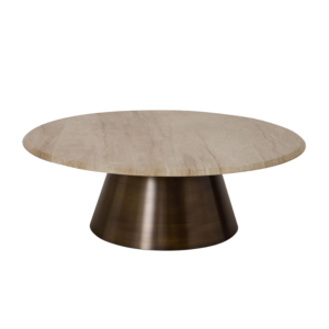 The Malibu Coffee Table features a round top crafted from Luna Bay marble, a unique Italian stone known for its sandy beige background, soft veining, and subtle bronzed or orange tones from natural iron inclusions.