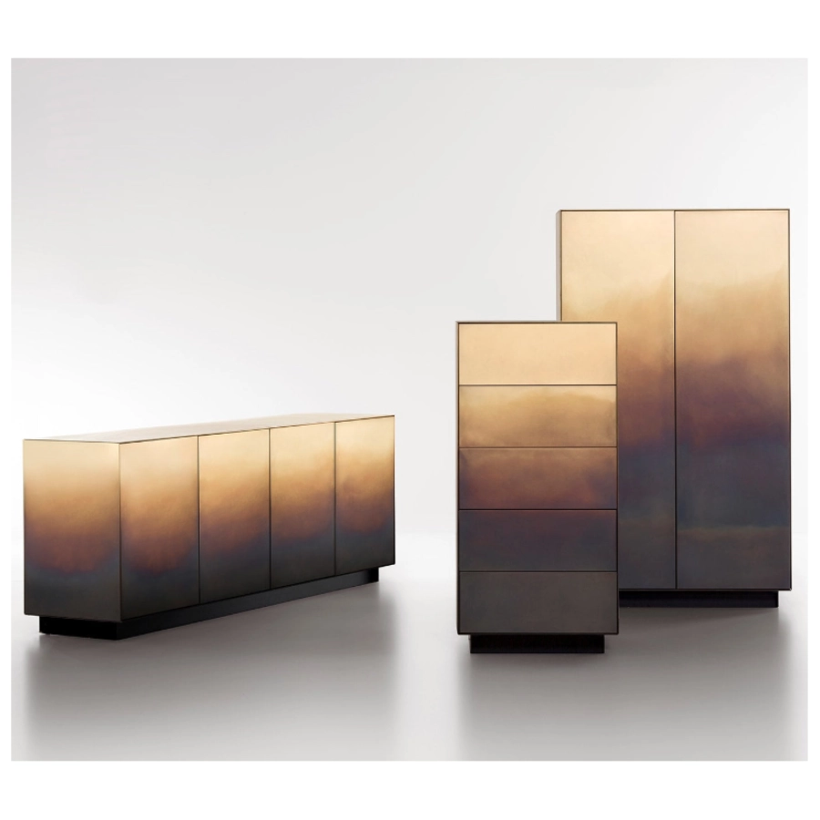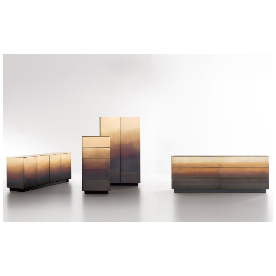Like the tide (marea in Italian) leaves its mark, wave after wave, even here the hand of the craftsman has left its sign, oxidation after oxidation, creating a painterly effect that resembles water’s erosion of the material. Somewhere between design object and work of art, each piece in the collection, composed of a chest of drawers, low credenza and cabinet, is unique thanks to an entirely hand-crafted finish that transforms the metal surface into a delicate watercolour.