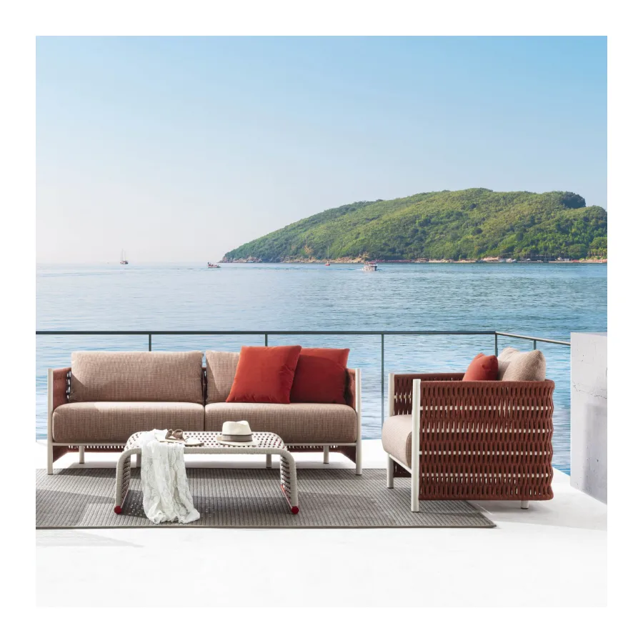 The new Marettimo collection includes a sofa, armchair, lounge chair and coffee table. The line’s soft, sinuous, enveloping shapes ensure utmost comfort, also outdoors. The design consists of an interweaving of ropes in bright, bold colours on a contrasting tubular structure. Ideal to extend your moments of relaxation outdoors.