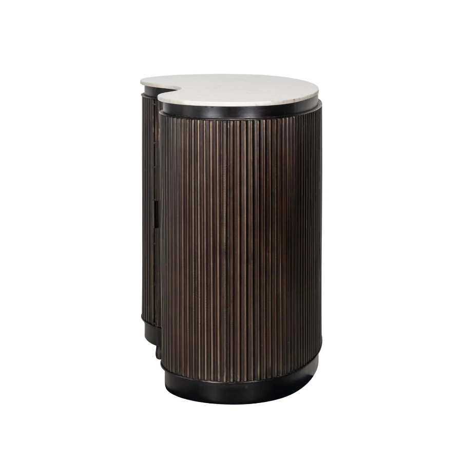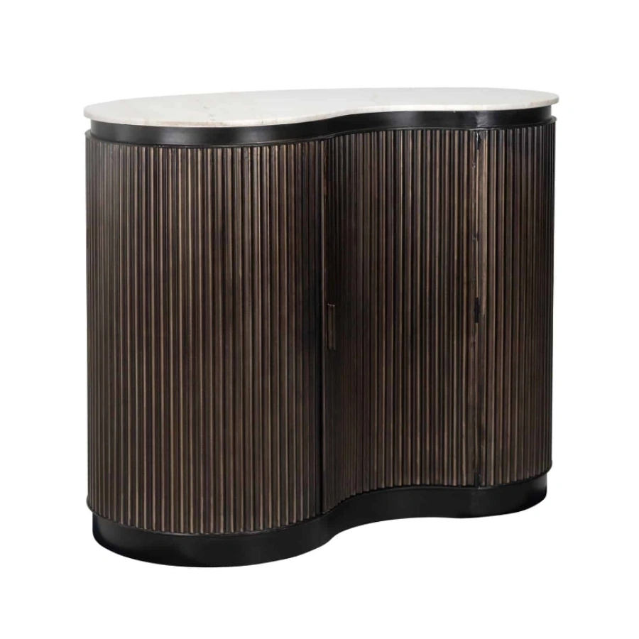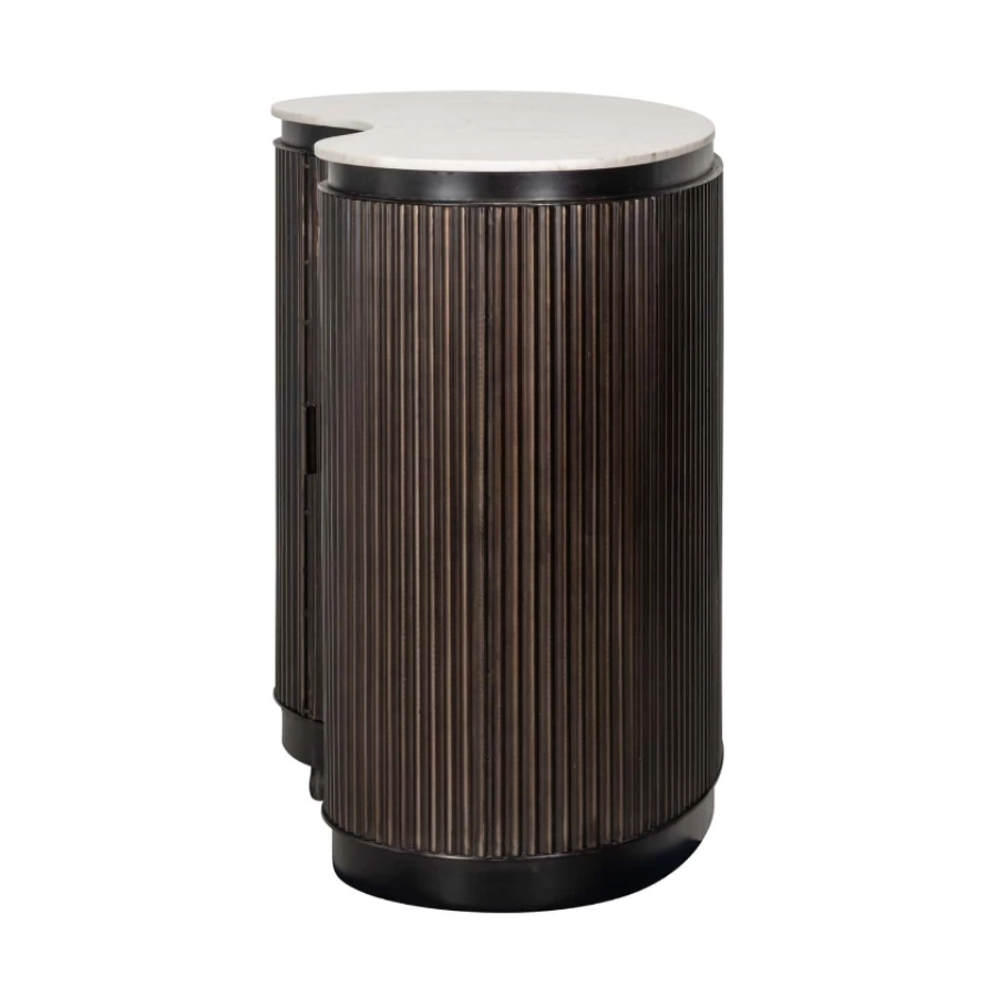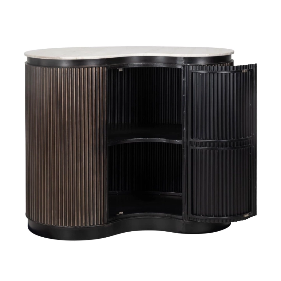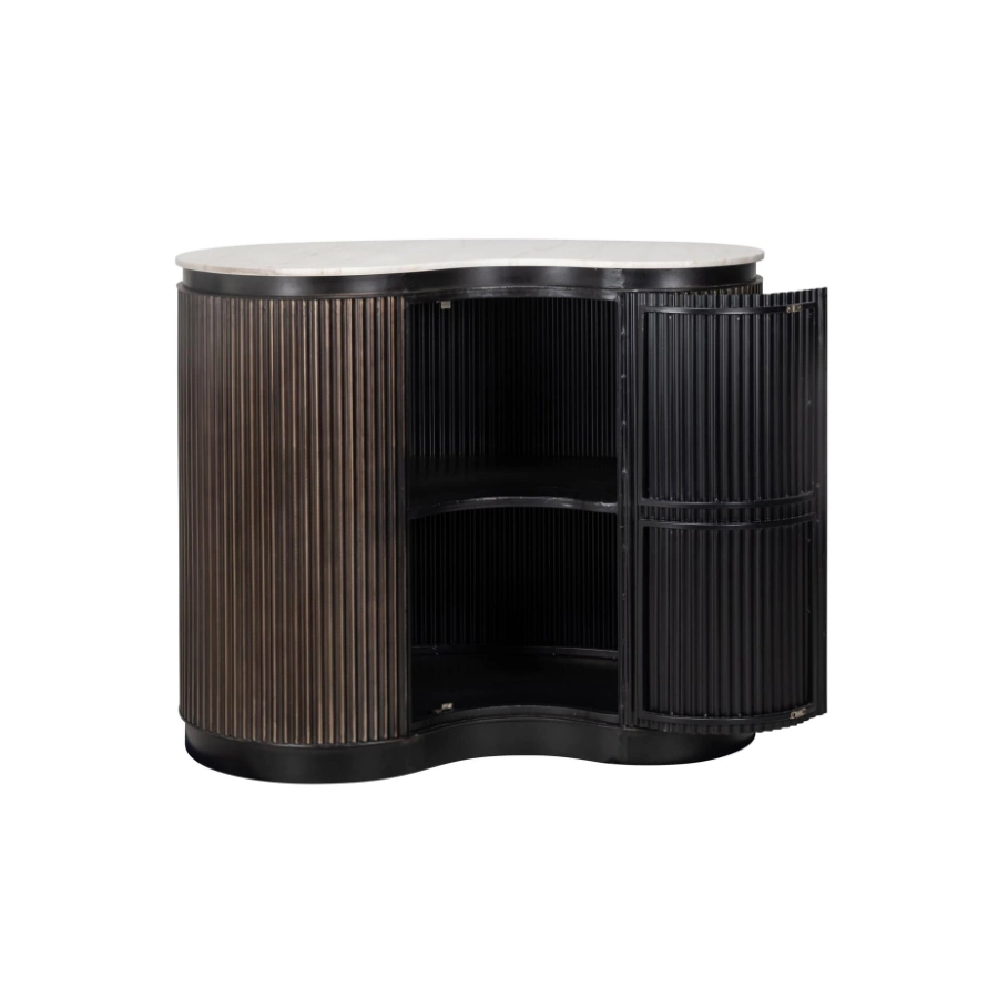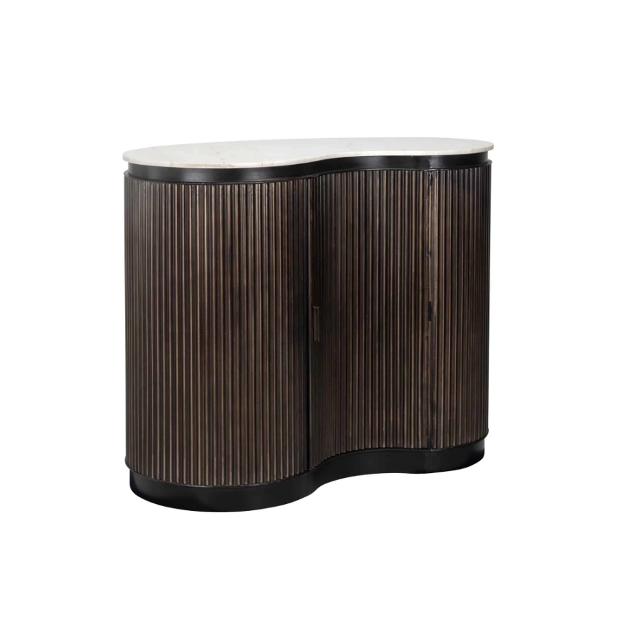 Crafted from rich brown mango wood, it boasts a curvaceous silhouette that exudes warmth and sophistication. The distinctive ribbed detail not only enhances its aesthetic appeal but also cleverly conceals a single door which opens to reveal shelved storage, ideal for organising your selection of bottles and glasses. A slab of smooth marble completes the look, creating an elegant serving platform that’s both beautiful and durable.