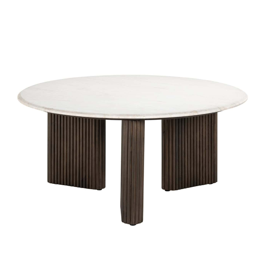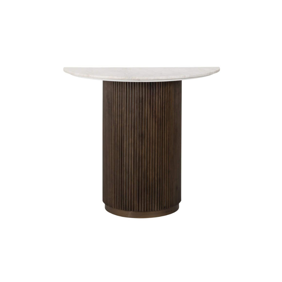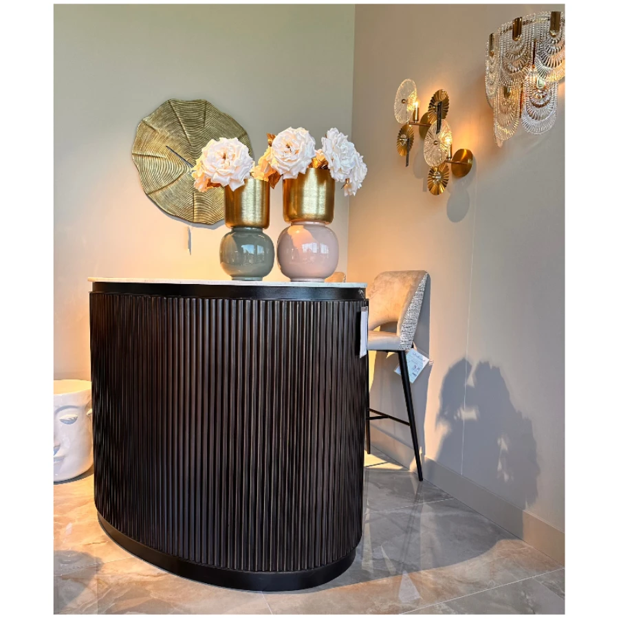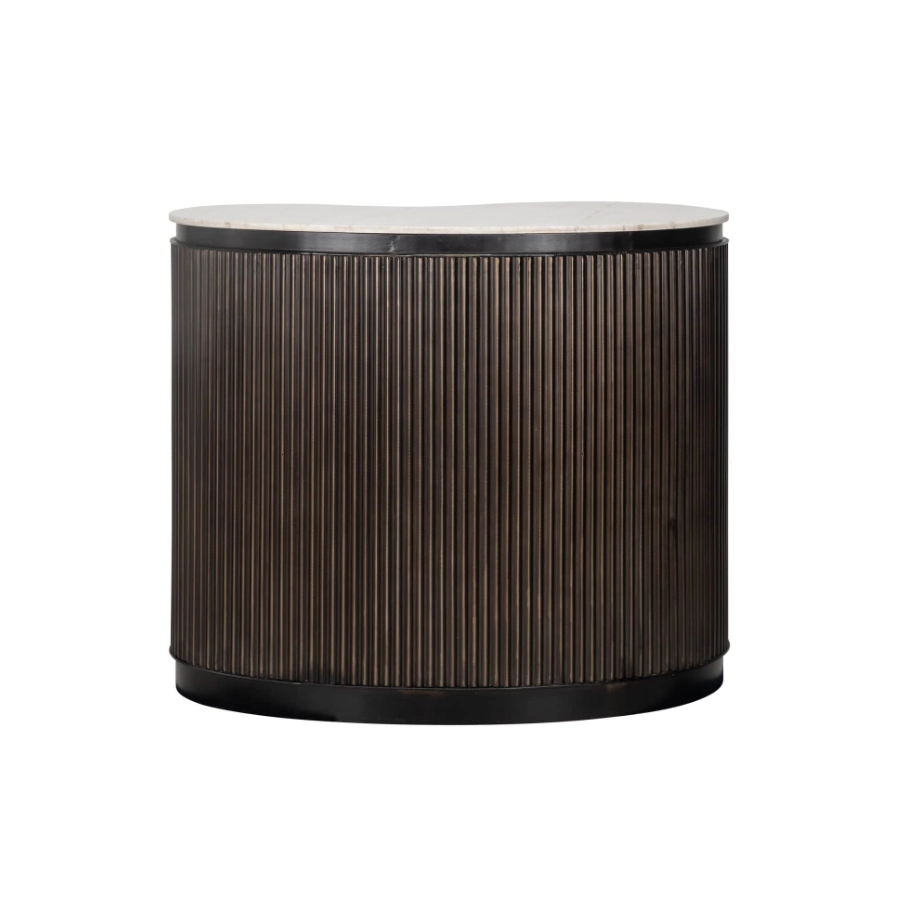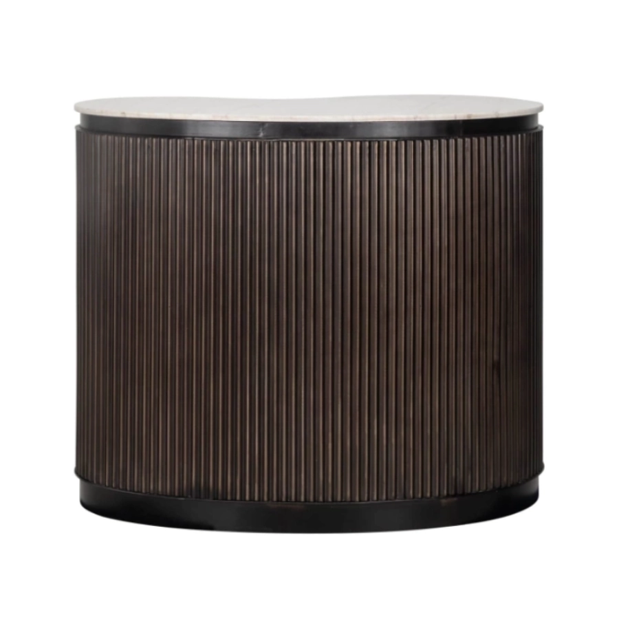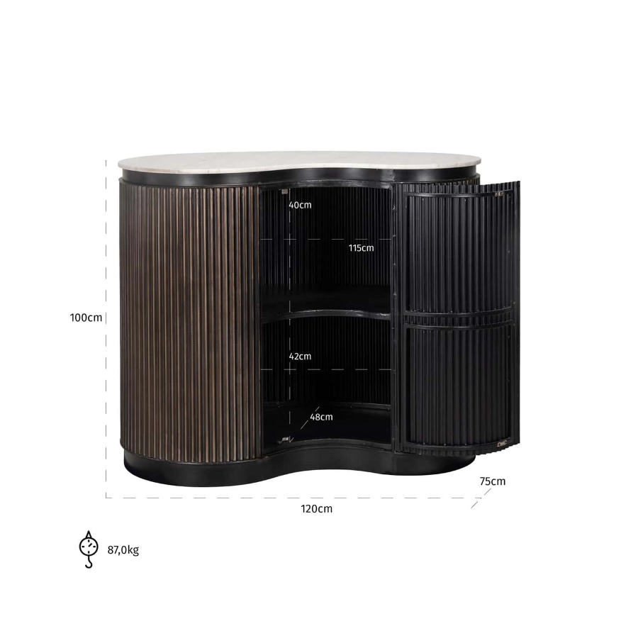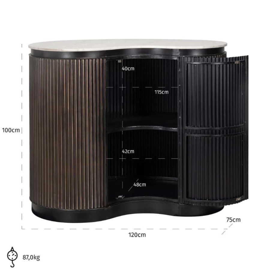 Crafted from rich brown mango wood, it boasts a curvaceous silhouette that exudes warmth and sophistication. The distinctive ribbed detail not only enhances its aesthetic appeal but also cleverly conceals a single door which opens to reveal shelved storage, ideal for organising your selection of bottles and glasses. A slab of smooth marble completes the look, creating an elegant serving platform that’s both beautiful and durable.