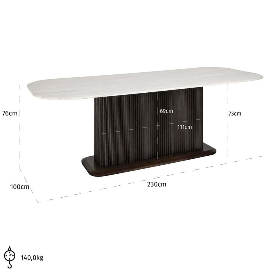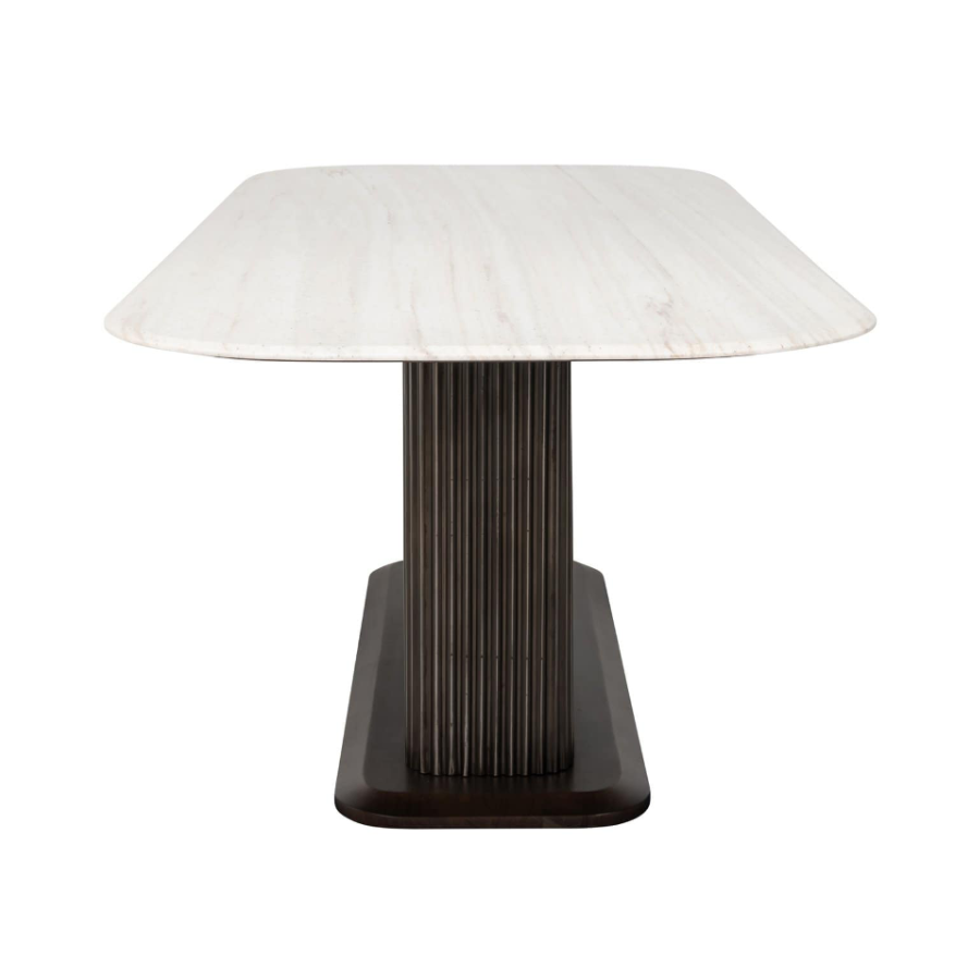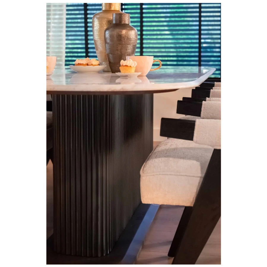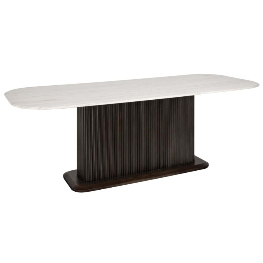 Standing proudly on a rectangular base crafted from dark brown mango wood it boasts both stability and a sense of grandeur. This is further accentuated by intricate ribbed detailing which adds a layer of visual intrigue and sophistication. Above this, a stunning marble top provides a luxurious stage for both casual family meals and elegant dinner parties.