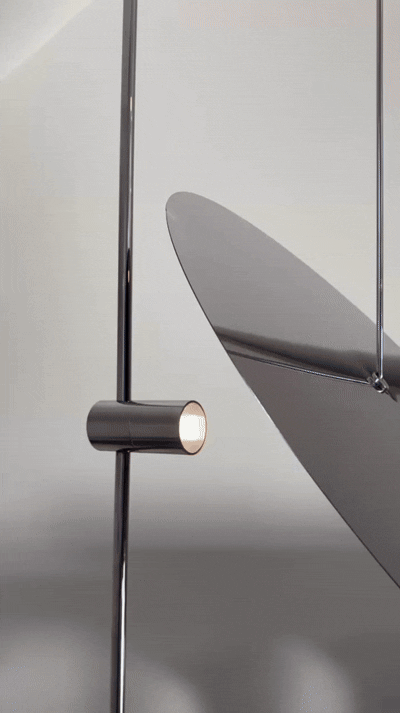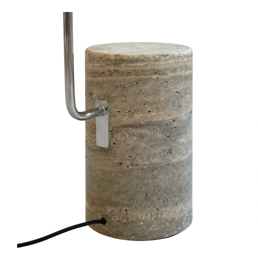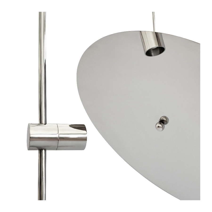Inspired by the ethereal beauty of the cosmos, this minimalist design embodies the quiet elegance of celestial bodies suspended in space. Two radiant light sources glow like distant stars, gracefully positioned along a polished chrome arm. Floating effortlessly, an oversized chrome lampshade mirrors the moon itself, casting a luminous reflection from both sides and creating an atmosphere of depth, clarity, and quiet wonder. Grounded by a solid Silver Travertine base, the Moon Lamp achieves the impossible – a balance between weight and weightlessness, structure and fluidity, function, and artistry.