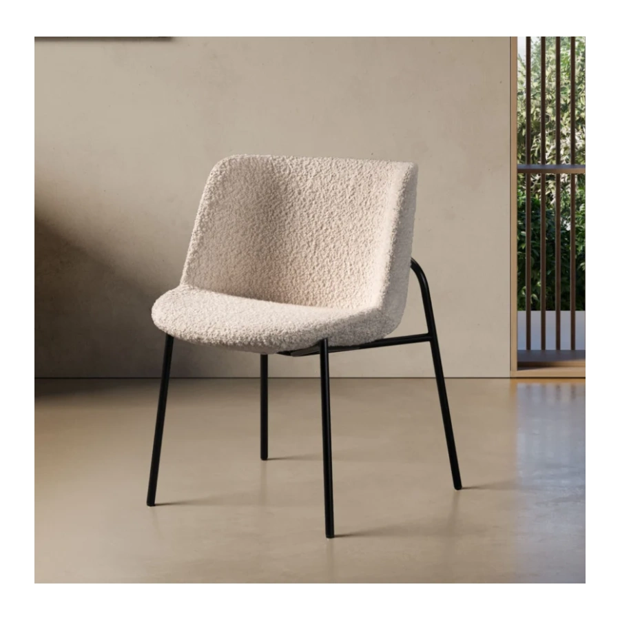 The Moon M Dining Chair offers enveloping comfort with its curved backrest and well-cushioned seat, both enveloped in plush cream boucle fabric. The tactile boucle heightens the visual warmth and creates a cozy, inviting presence suitable for dining rooms, bedrooms, or lounges. The chair stands on black metal legs for stability and finished in matte, that complements the soft tones of the upholstery. Its understated lines and minimalist profile ensure versatility, pairing seamlessly with a wide variety of tables and interior design styles.