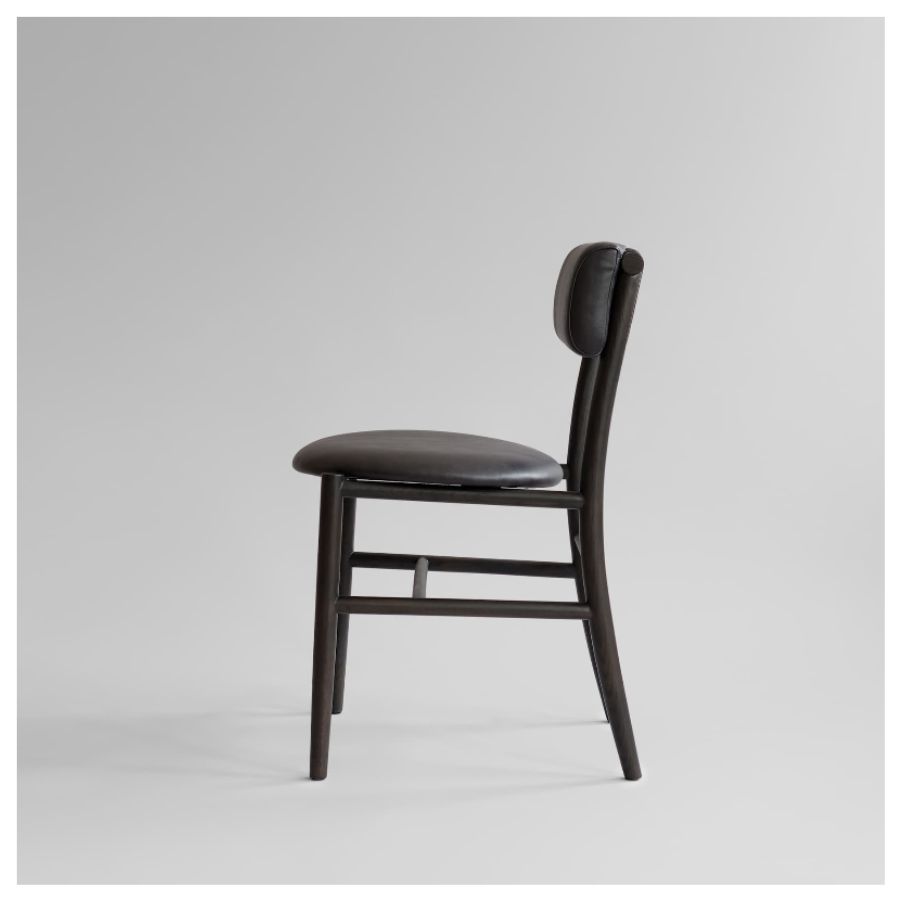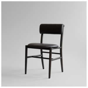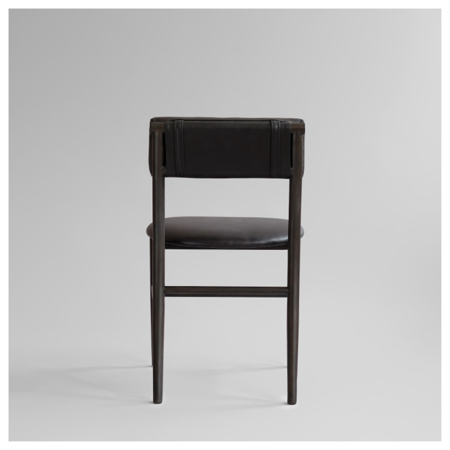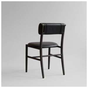 The chair is lightweight, elegant, and sturdy, available with or without armrests, making it a versatile fit for both private homes and commercial spaces. Its distinctive upholstered backrest, inspired by Copenhagen bicycle bags, is secured with simple straps for both comfort and visual appeal, complemented by a fully padded seat for an enhanced user experience.