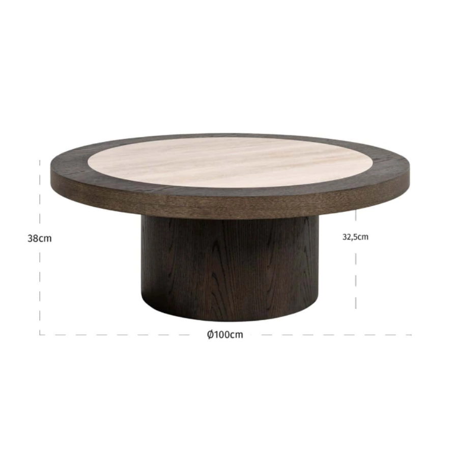 Showcasing a considered mix of materials, it captivates with the striking contrast of light and dark finishes. The circular base, crafted from oak veneer and recycled wood, radiates natural warmth, with the rich dark brown finish accentuating the wood grain. Above, the rounded top is divided between a coordinating wooden trim and a travertine-effect ceramic centre, creating depth and visual intrigue.
