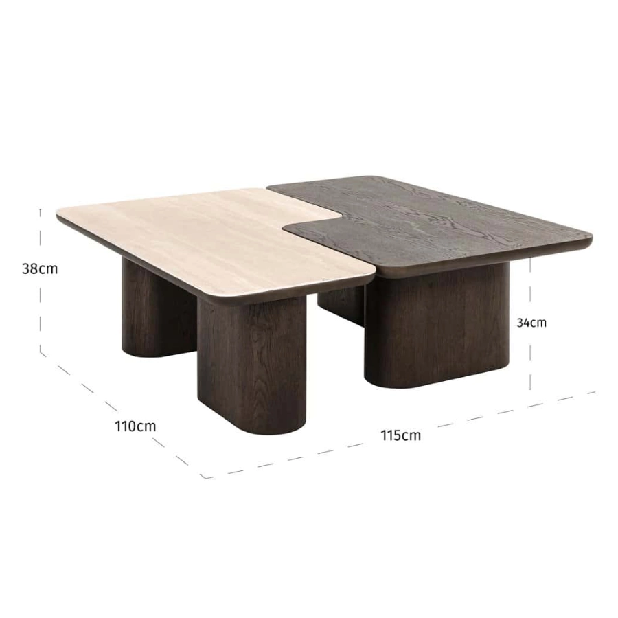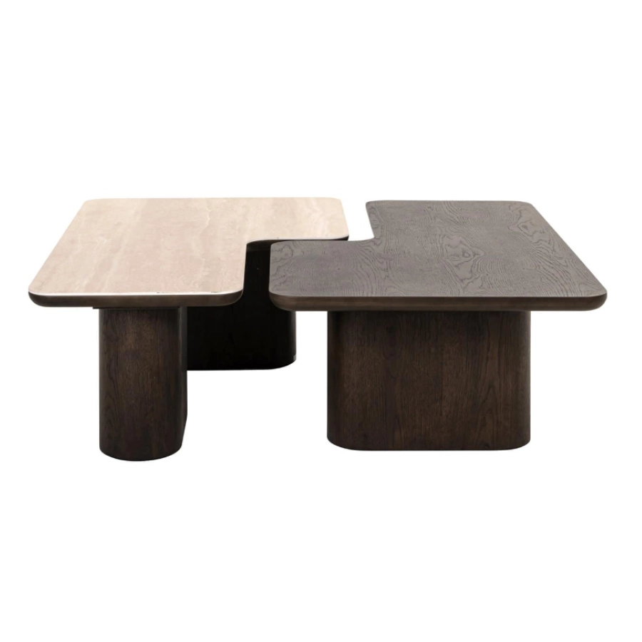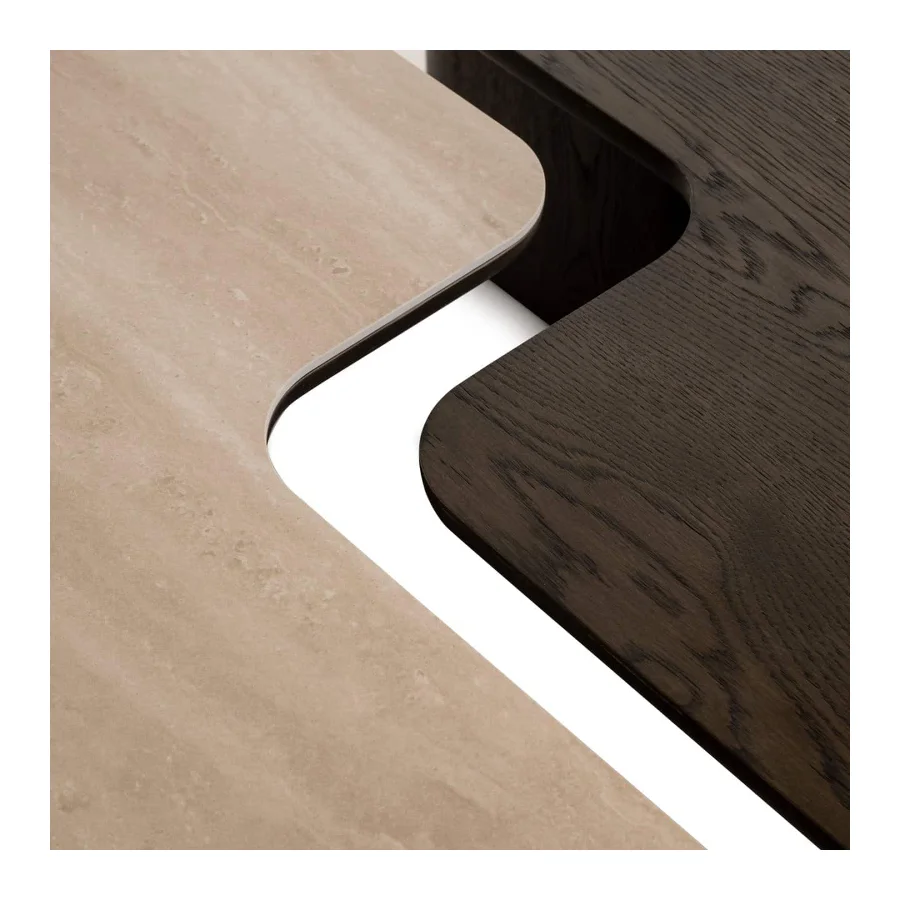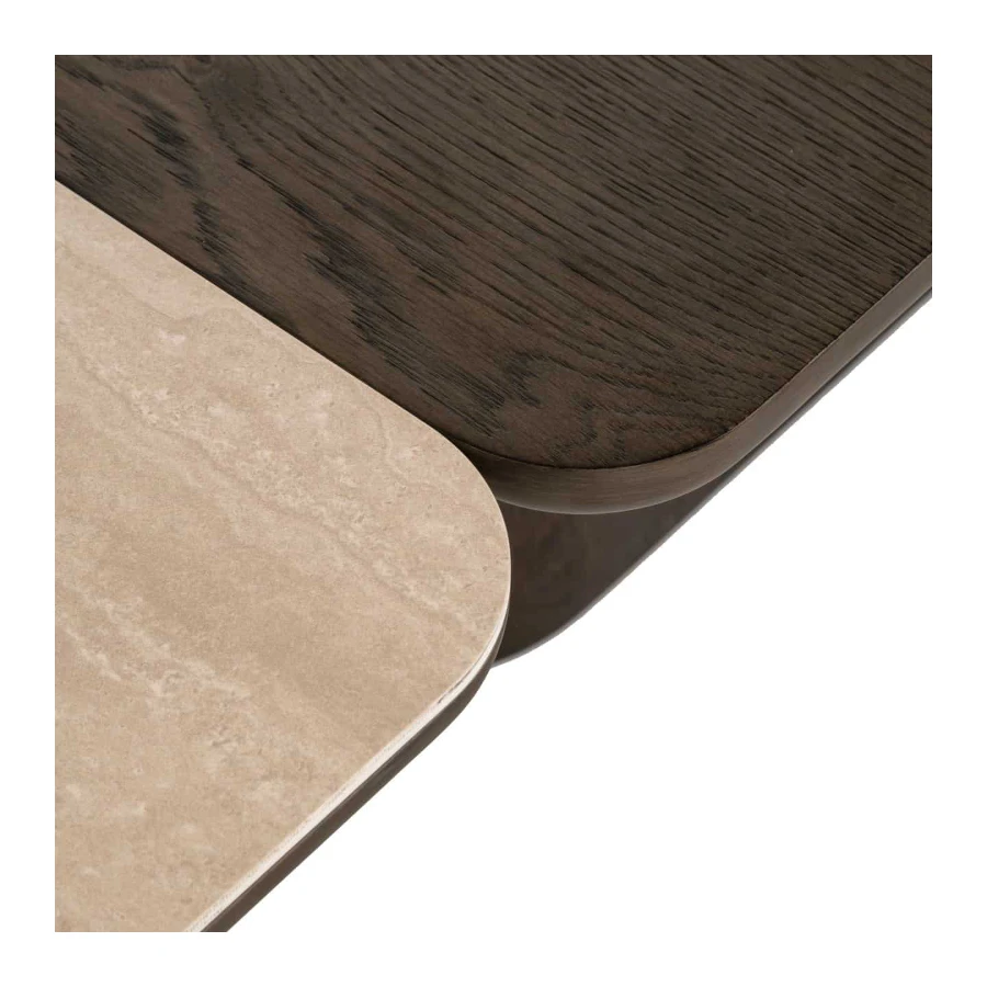 The coffee table set Nando consists of two stylish tables with a unique design, executed in travertine ceramic and oak veneer.