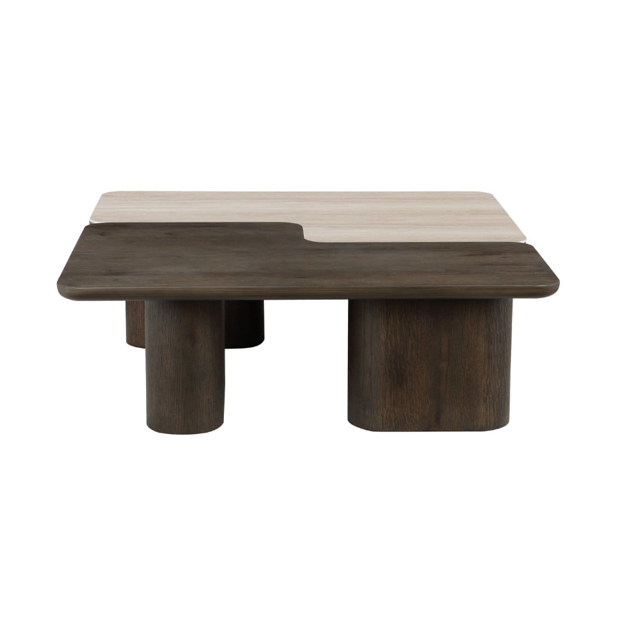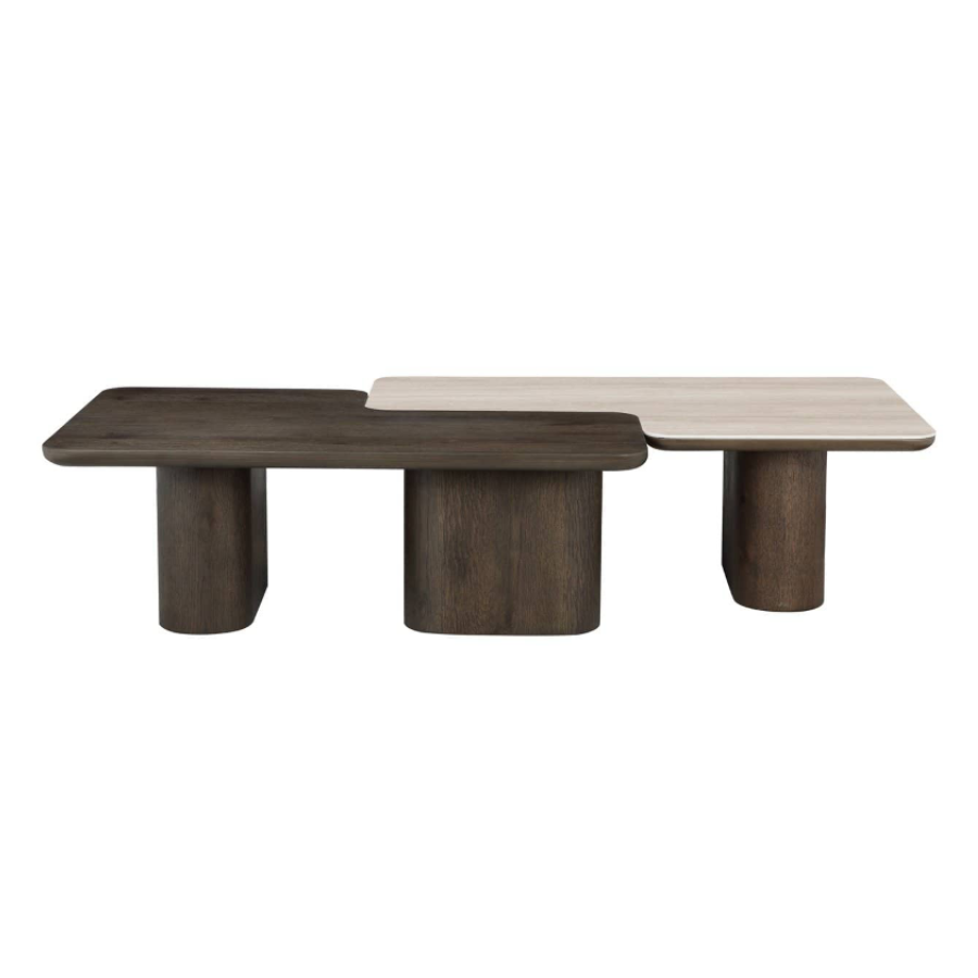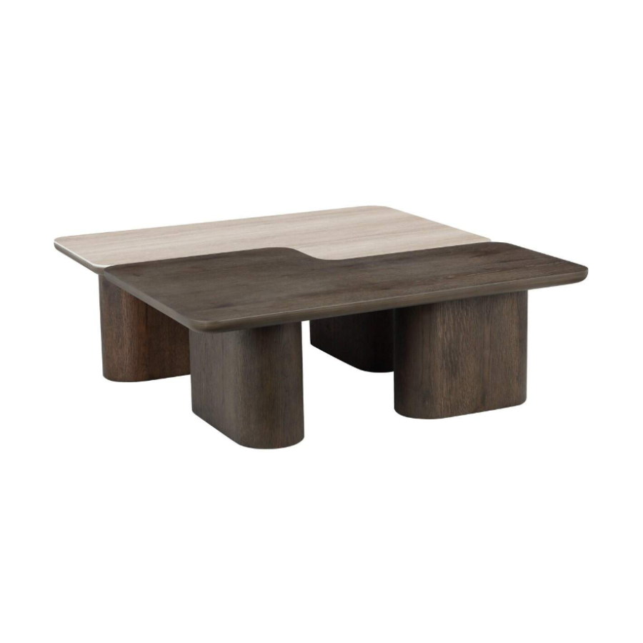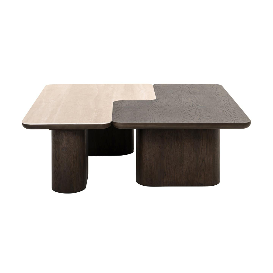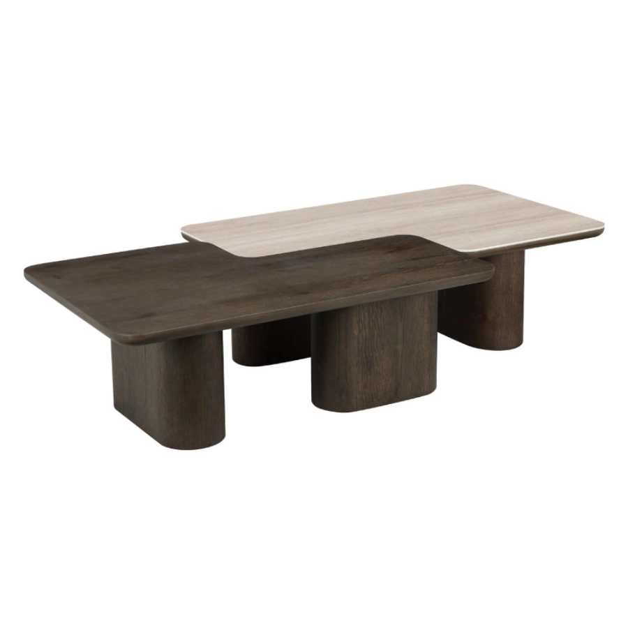 The coffee table set Nando consists of two stylish tables with a unique design, executed in travertine ceramic and oak veneer.