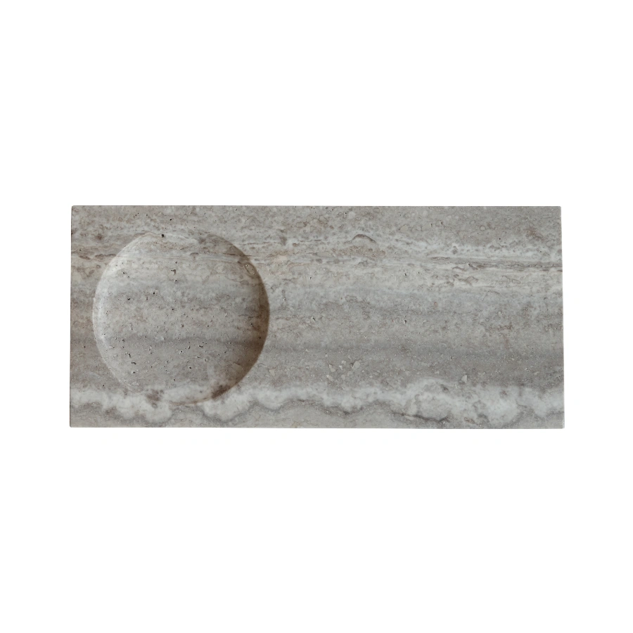 As travertine is porous, spills should be wiped away promptly to avoid staining, particularly from liquids such as wine, coffee, or oils. Avoid acidic or alkaline cleaners, vinegar, citrus, or abrasive pads, as these may etch or scratch the stone. For serving, use utensils with care and avoid cutting directly on the surface to preserve its finish.