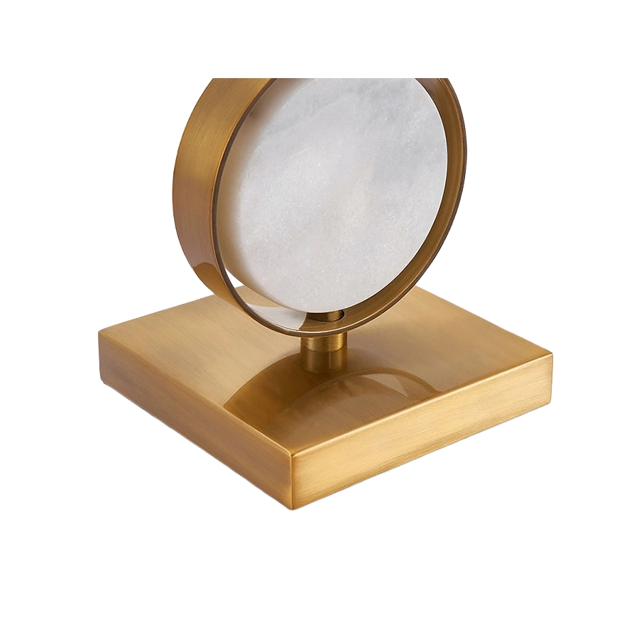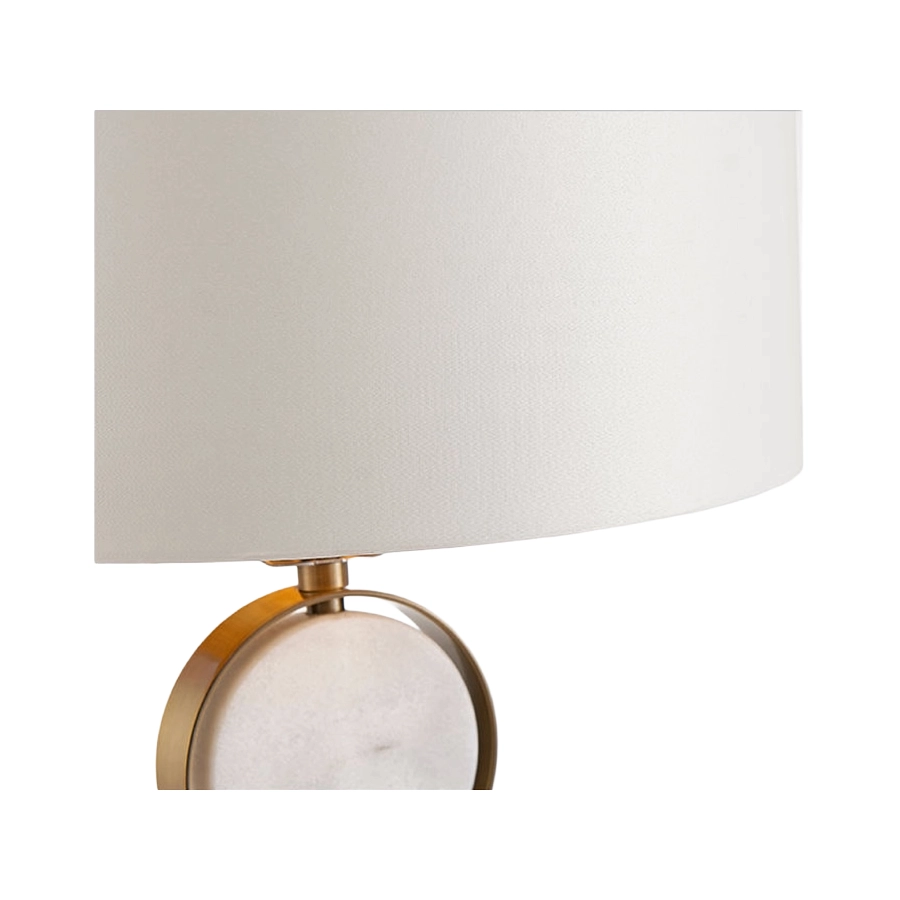 It features a brass and marble base, complimented by a soft natural coloured shade.