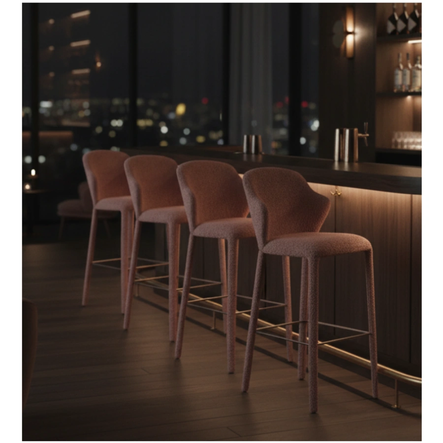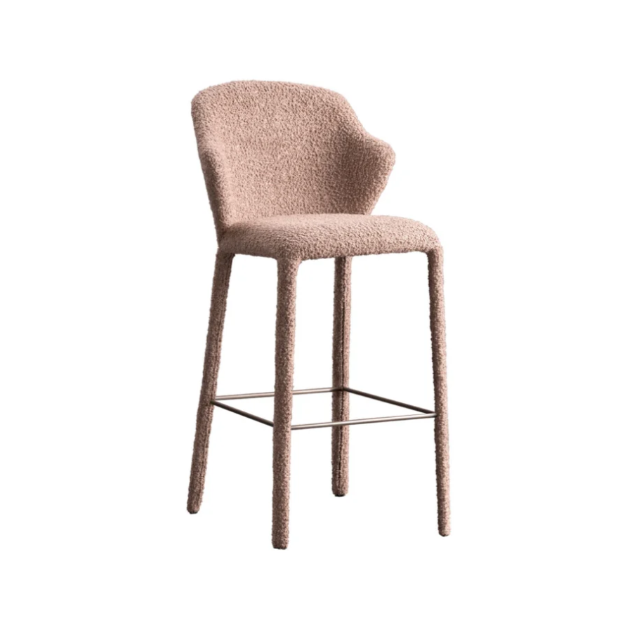 The Opera Bar Stool features a distinctively sculpted seat and backrest, fully upholstered in plush coral blush boucle fabric that envelops the entire silhouette for a monochromatic, textural effect. The boucle upholstery not only adds visual warmth and trend-forward appeal but also enhances comfort with its soft, inviting feel. A supportive, gently flared backrest, integrated arm contours, and generous seat cushioning make this stool ideal for lingering in lounges, kitchen islands, or elegant bar settings. The slender, subtly tapered legs blend seamlessly into the upholstered frame, while the metallic footrest provides a chic accent and additional durability.​