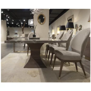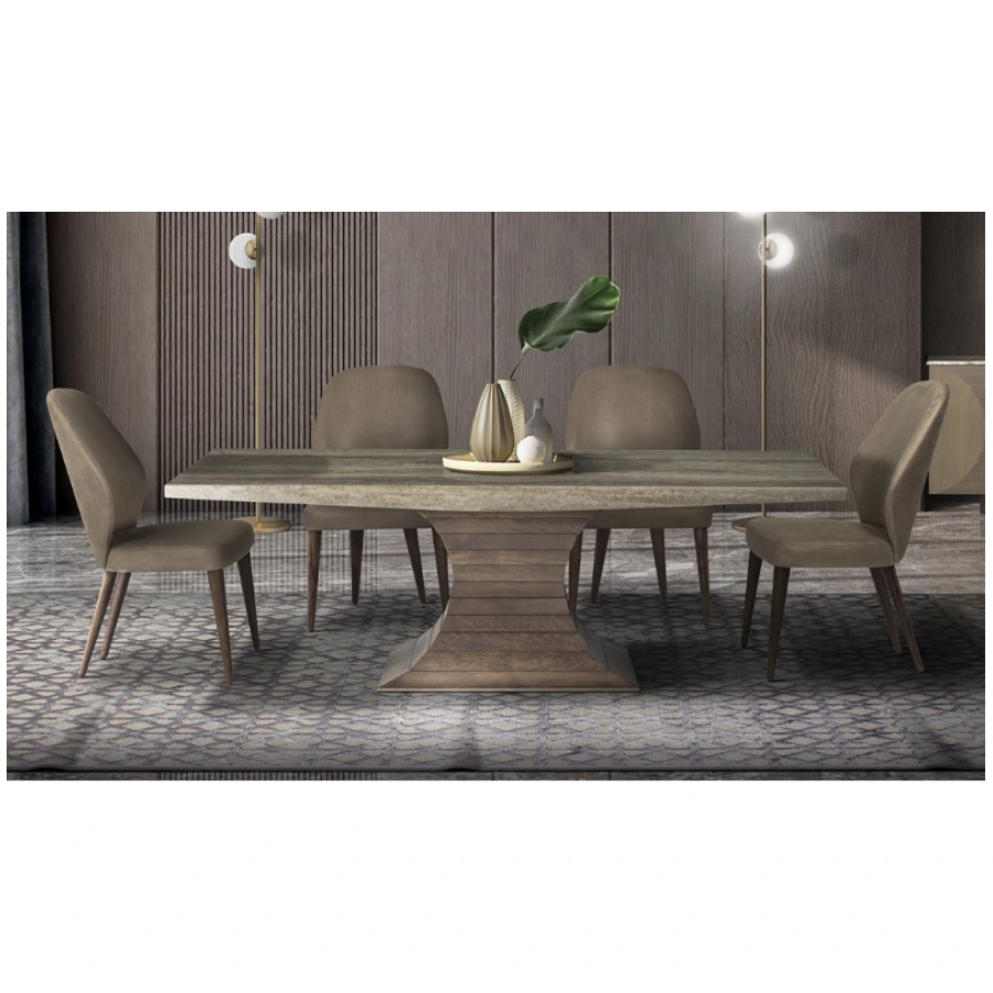 The Opera Large Rectangular Dining Table features a striking combination of an Italian Glam Travertine stone top and a sculptural walnut wood base. This piece showcases both timeless elegance and contemporary sophistication, making it a centerpiece for luxury dining spaces.