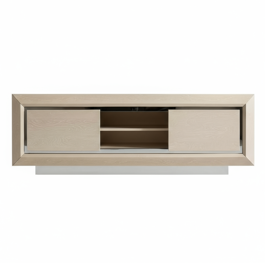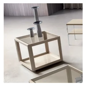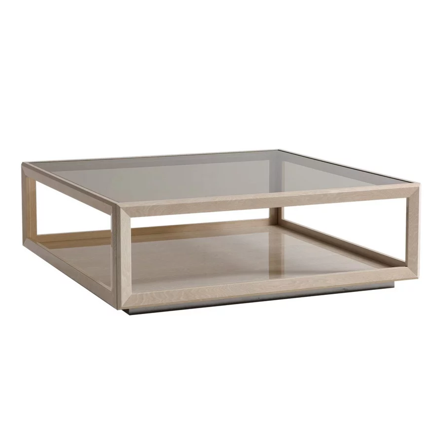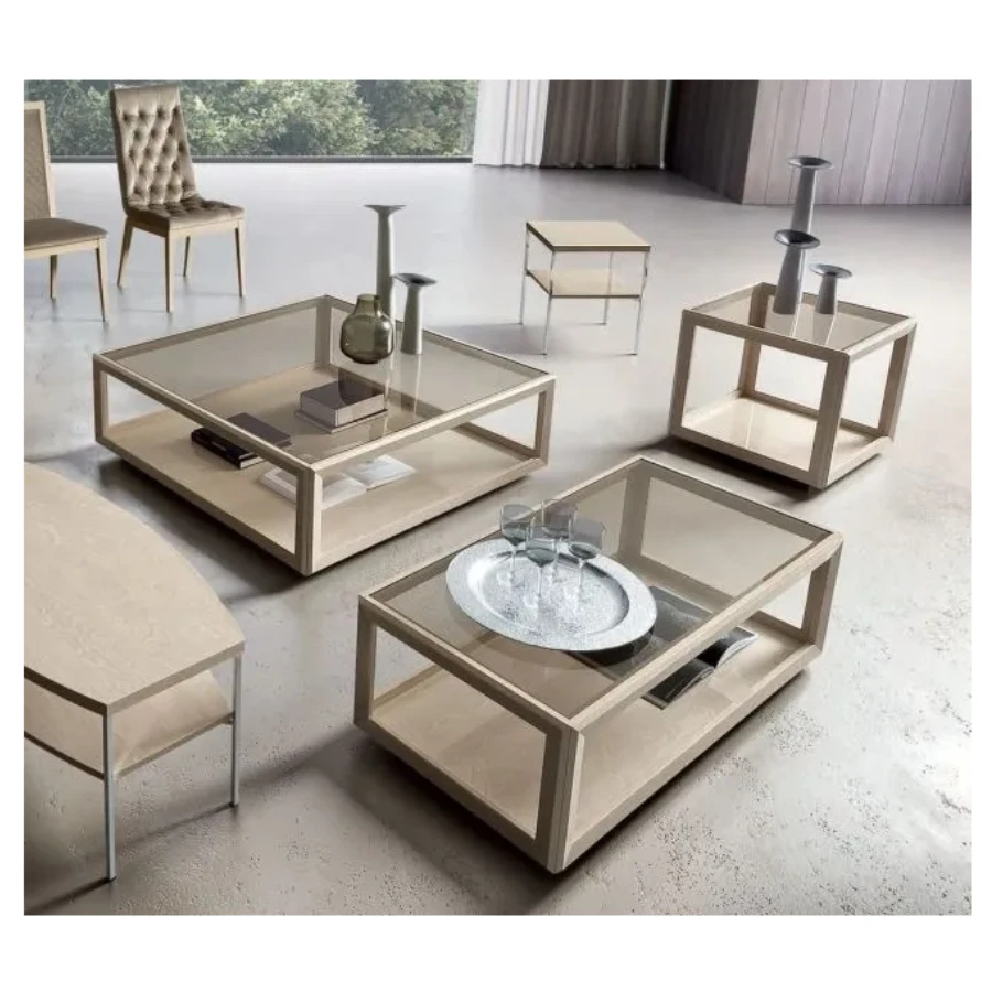 This table combines the warmth of sand birch with the modern gleam of fumed glass, ideal for contemporary and luxury living rooms or bedrooms.