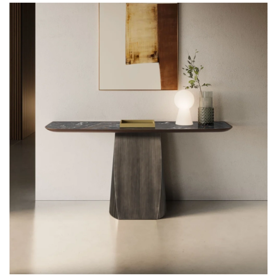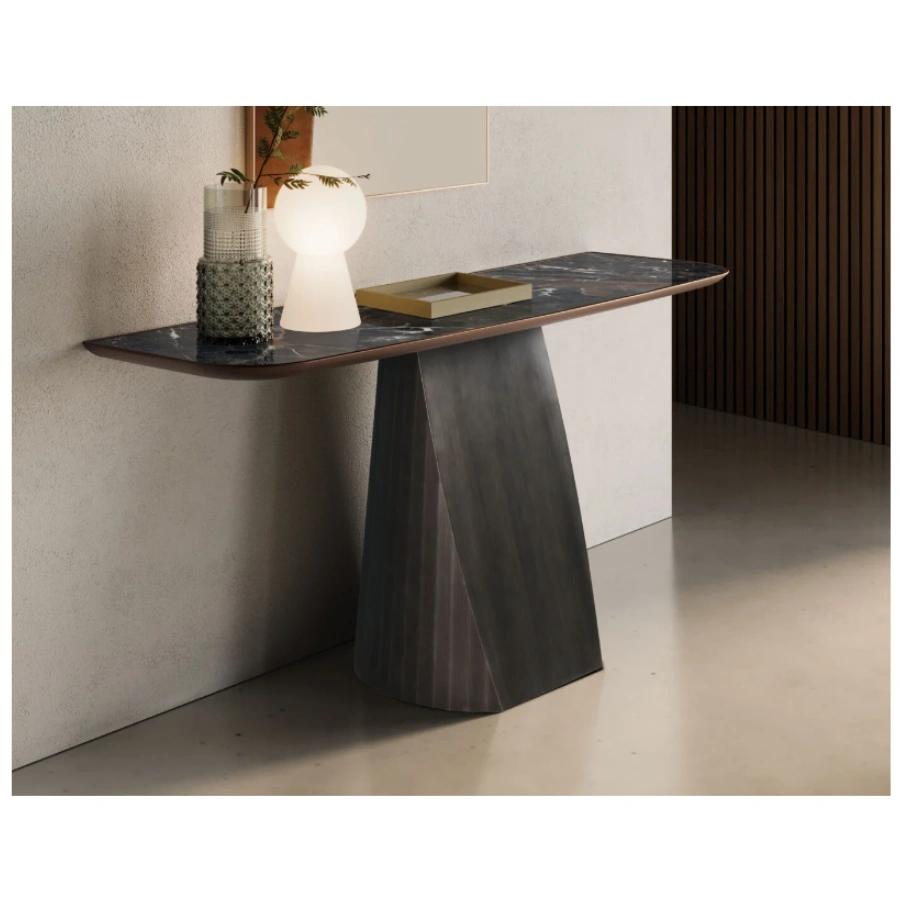 ​ This console table features a unique geometric base, where sharp, angular shapes merge to create a harmonious and impactful design statement. The brushed champagne metal base is meticulously hand-finished, offering a refined contrast to the dramatic Black Marquinia ceramic tabletop, which delivers both visual depth and functional durability. Its elongated proportions and slender silhouette make it ideal for hallways, living rooms, or entryways seeking a touch of modern Italian elegance.