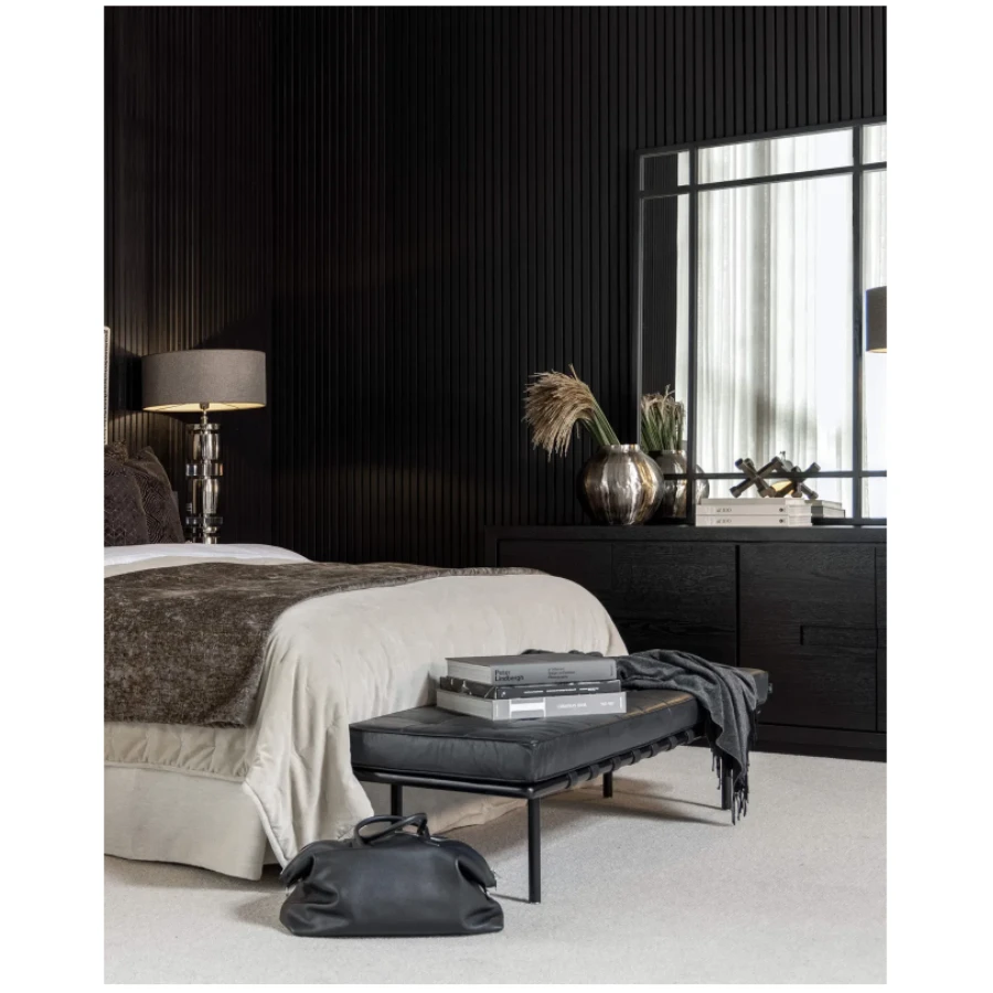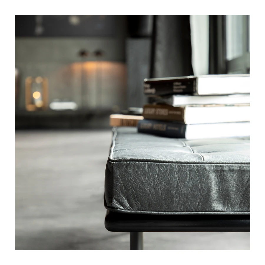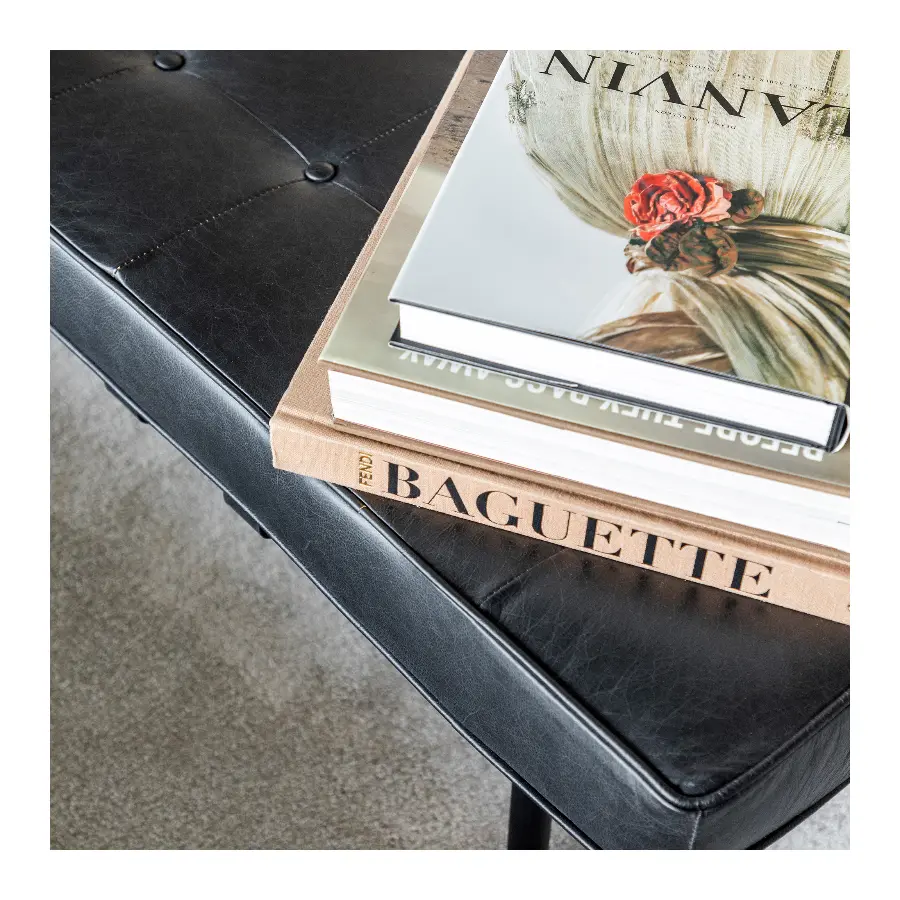 The bench features a frame made of robust black metal, providing both stability and a sleek appearance, while the soft and comfortable seat is upholstered in high-quality genuine leather. Its elegant design makes it perfect for the hallway, living room, or bedroom, adding a sophisticated touch to your interior. This bench serves not only as a seating option but also as a design piece that offers both function and luxury. The leather upholstery is durable and ages beautifully over time, making this a sustainable choice for your home.