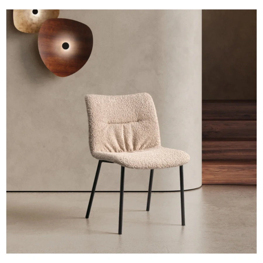 ​With a cocooning silhouette, Relax M wraps you in comfort through its softly ruched, generously padded seat and gently rounded backrest. The tactile cream bouclé fabric adds a touch of luxury and understated texture, making the chair perfect for cozy dining spaces, casual meeting rooms, or chic lounge areas. Its metal legs—finished in a rich, dark tone—provide elegant contrast, ensuring both visual warmth and superb structural integrity.