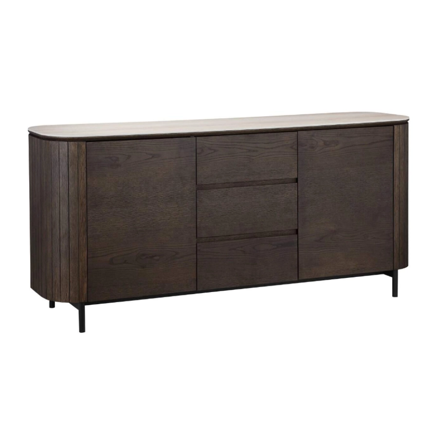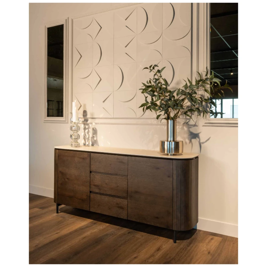 The Ritz sideboard combines modern design with natural materials, crafted from oak veneer, ceramic, MDF and recycled wood.