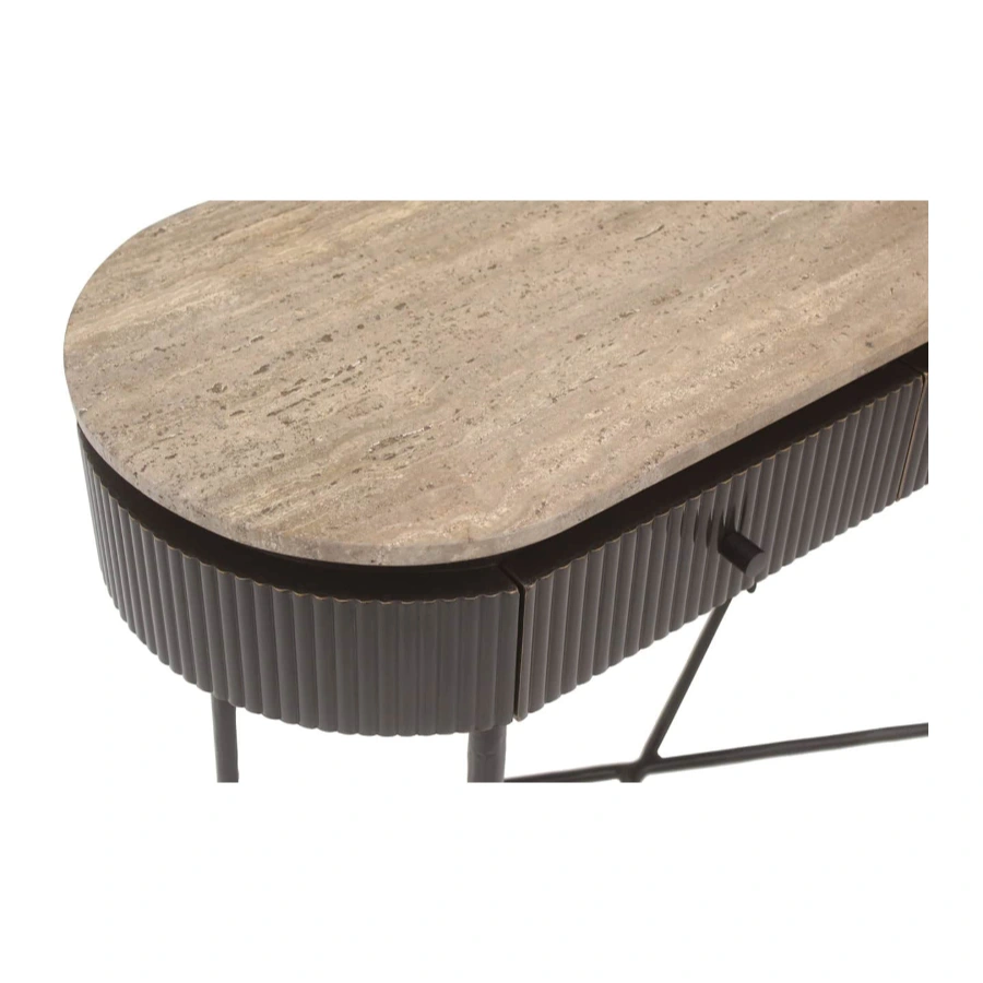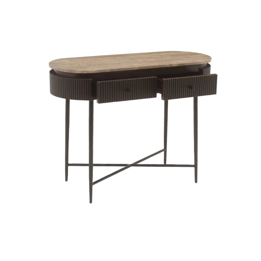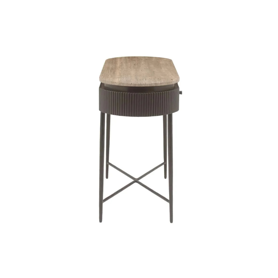 This console features a rich brown travertine stone top, showcasing natural striations and subtle variations in colour that bring organic beauty and unique character to each piece. The travertine’s smooth, honed surface forms an elegant shape, offering both visual warmth and a tactile experience. Below, the ribbed brown aluminium frame brings strong architectural lines and sophisticated detail, while two integrated drawers provide practical storage. The slender metal legs, set in an intersecting X formation, create an open and airy profile with enduring stability.