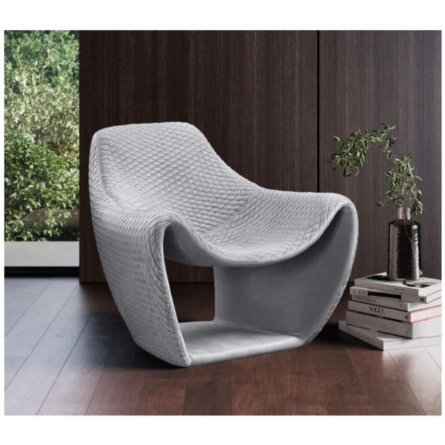 The Samsara Lounge Chair showcases a sculptural, fluid silhouette accentuated by an enveloping seat and distinctive diamond quilting across its entire surface. Upholstered in top-grade dove grey leather, the chair’s tactile patterning provides visual interest and a soft, inviting touch, while the swooping contours ensure ergonomic support for relaxed seating.​​