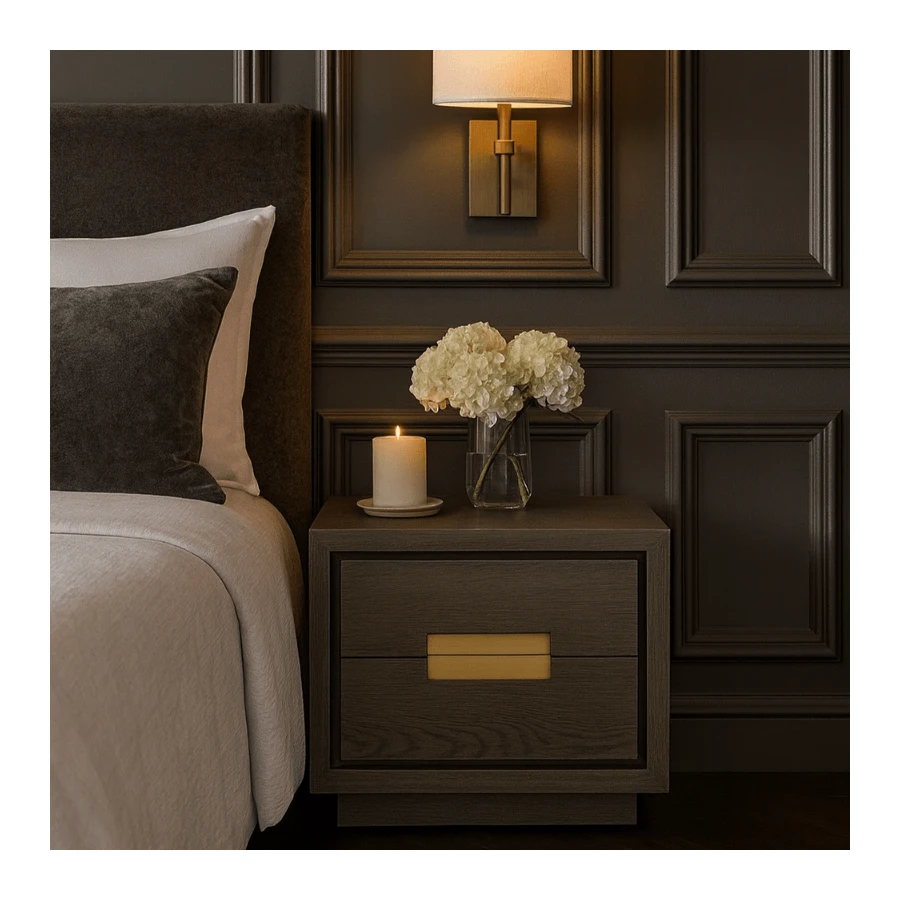 The Sevilla 2-Drawer Bedside Cabinet comes in a textured grey/taupe coloured oak veneer and has brass inlay handles in a striking design.