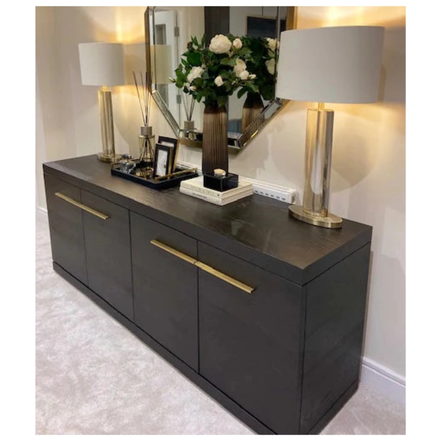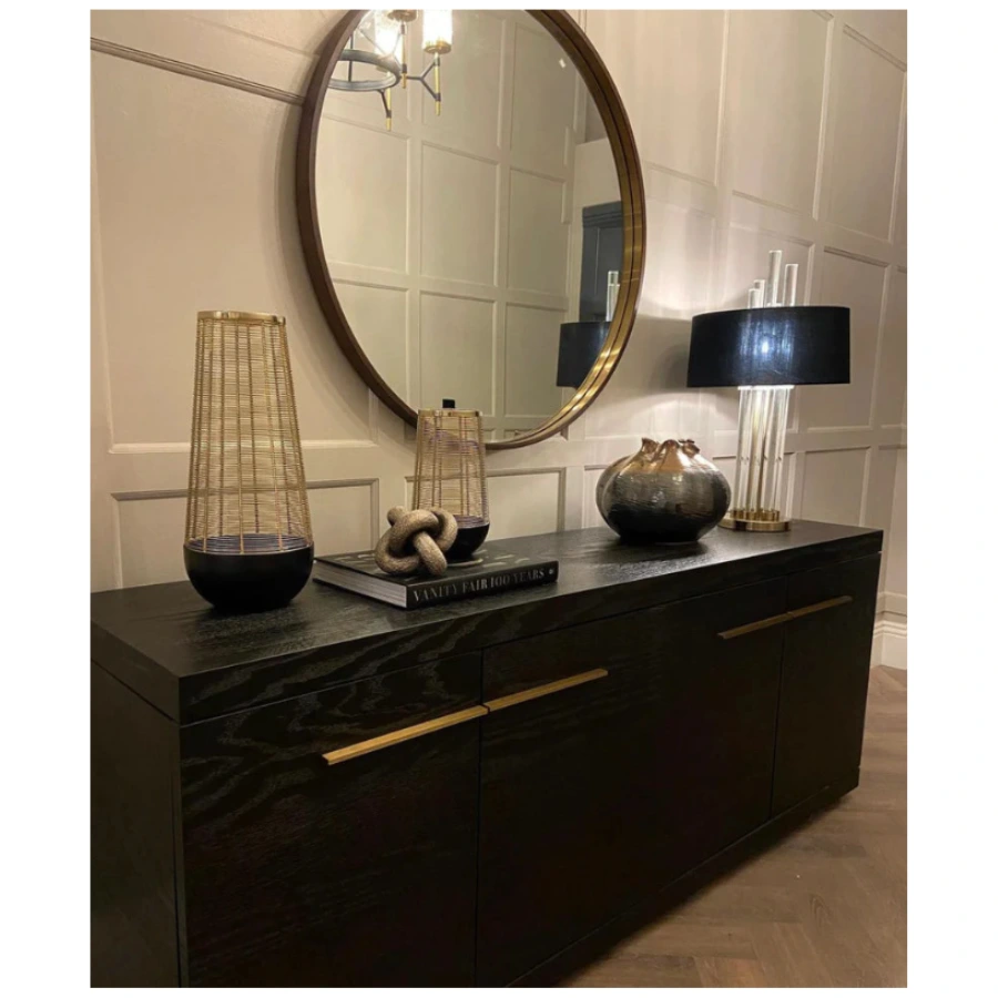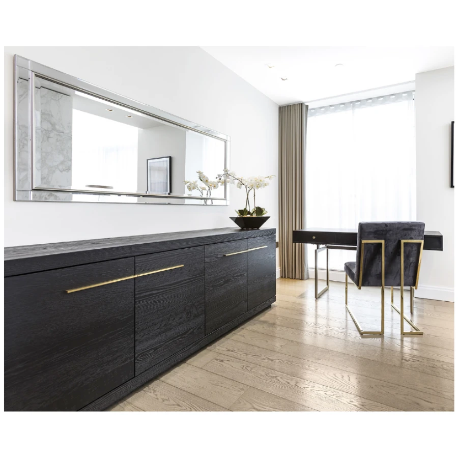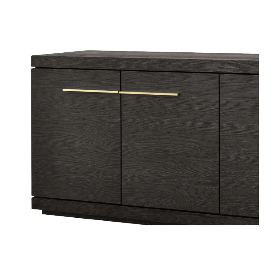 The Sorrento 4-Door Sideboard comes in a brown oak veneer with gold handles in a contemporary linear shaped design.
