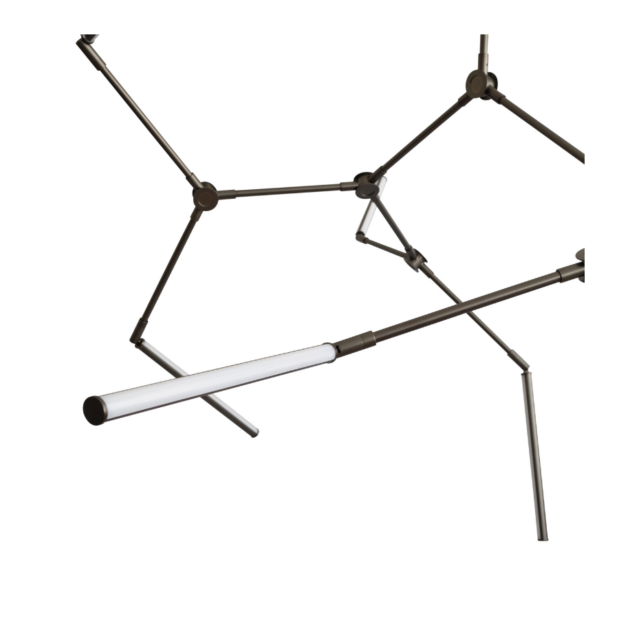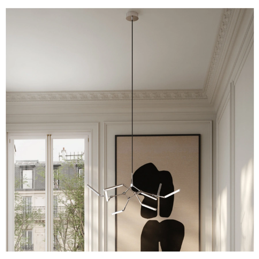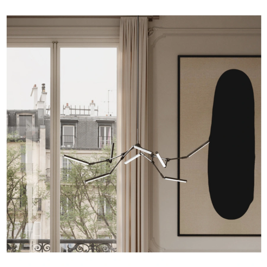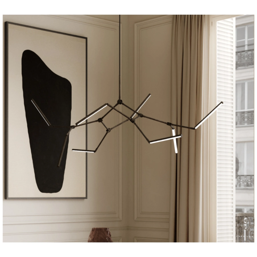 Drawing inspiration from minimalist art, the Stick Chandelier seamlessly melds light and sculpture, creating a striking graphic lighting design.
