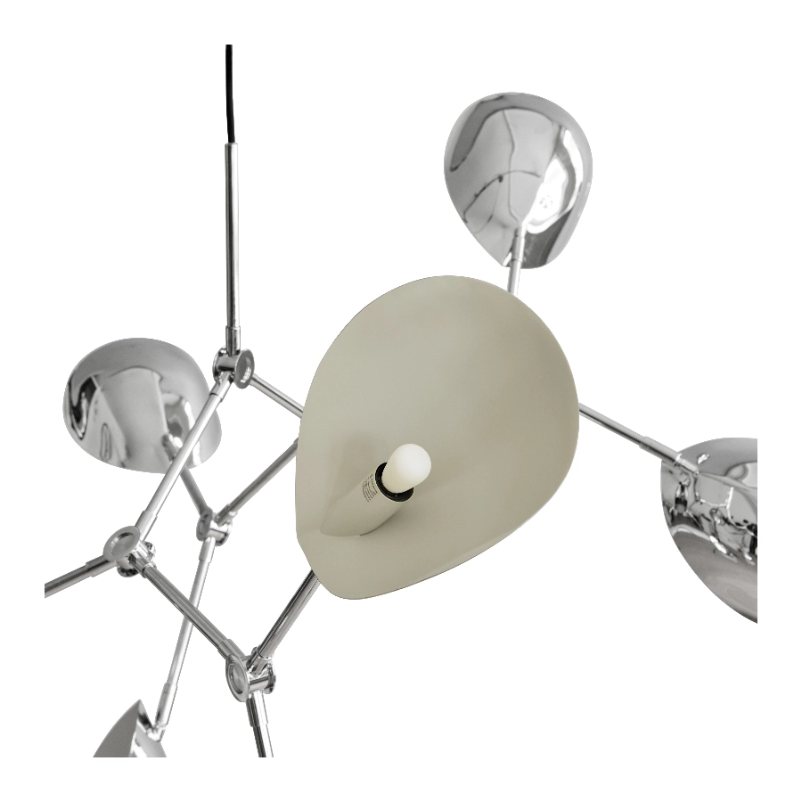 Finished in polished Chrome, the chandelier reflects its surroundings with mirror-like clarity, adding brilliance and sophistication to any interior. Suspended from an adjustable arm, the Stingray lampshade hovers in perfect equilibrium, counterpoised by a delicate sphere—an artistic expression of contrast and weightlessness.