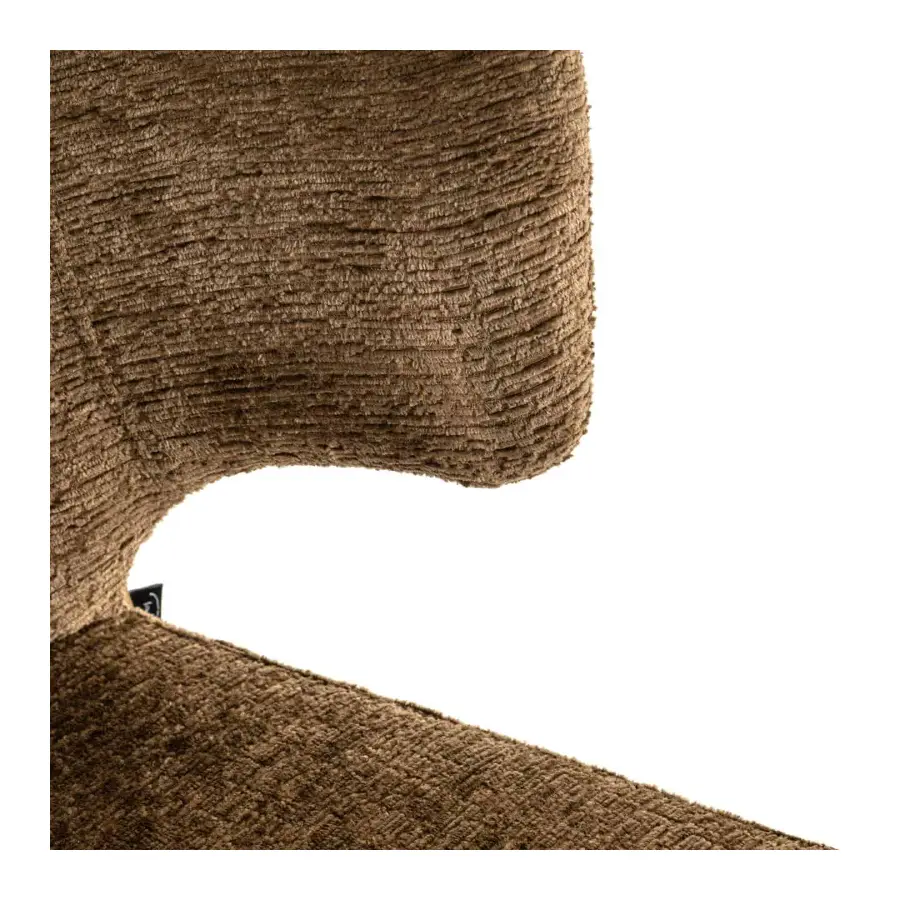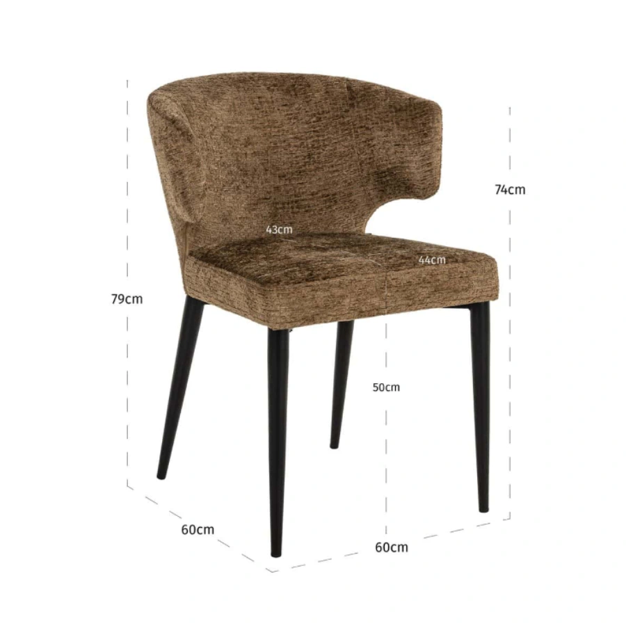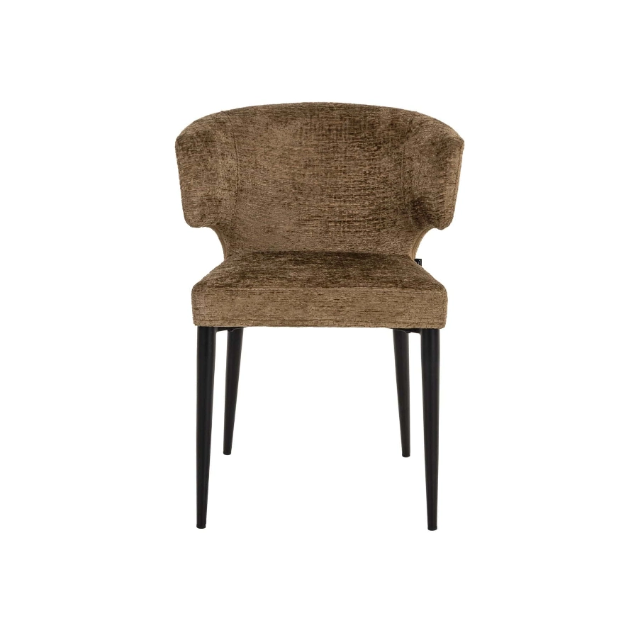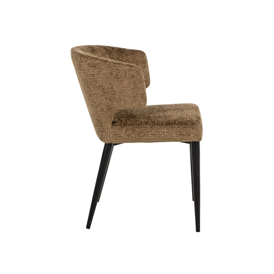 Supported by four sleek black metal legs, its design is highlighted by an elegantly curved backrest that not only enhances its visual appeal but also offers unparalleled comfort and support. Wrapped in luxurious brandy fusion fabric upholstery, it adds a touch of warmth and sophistication, complementing its modern aesthetic.