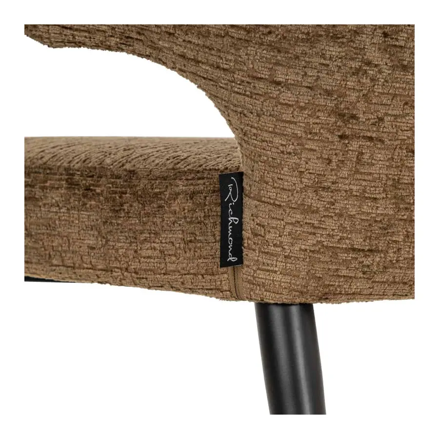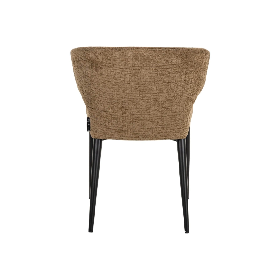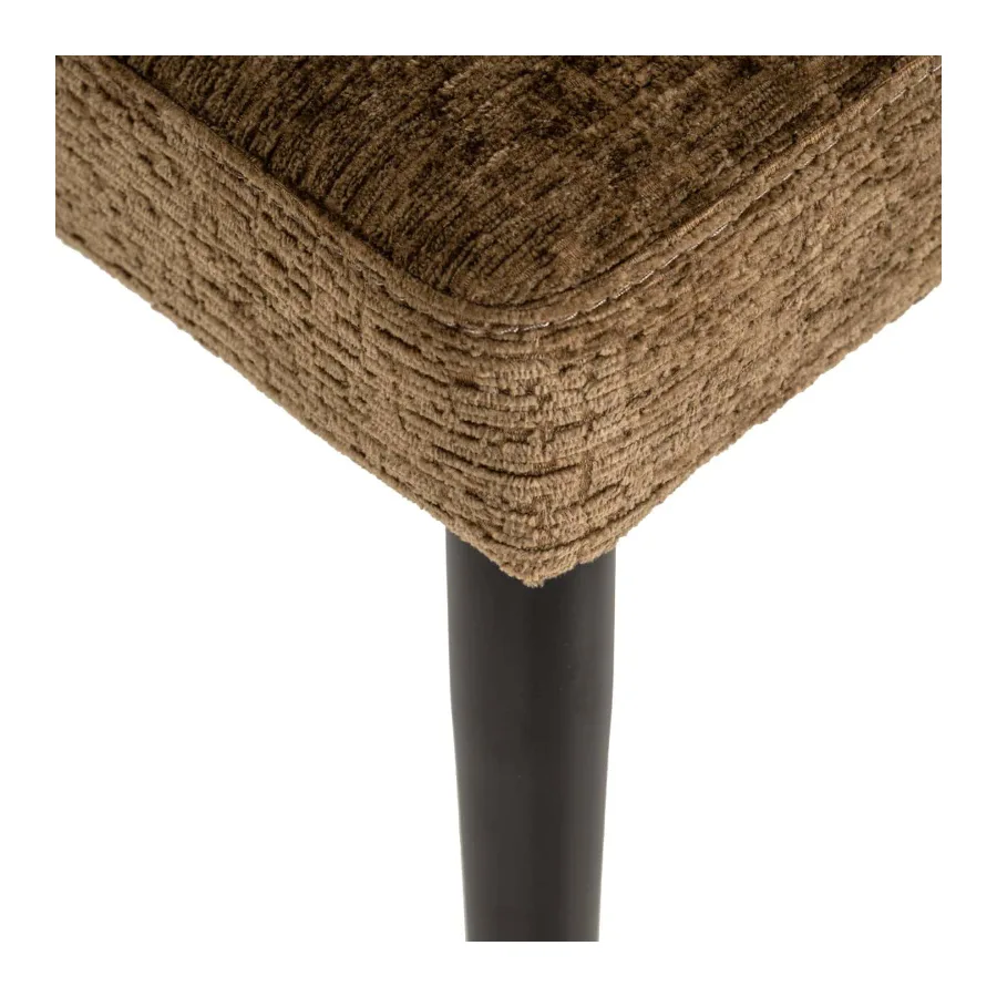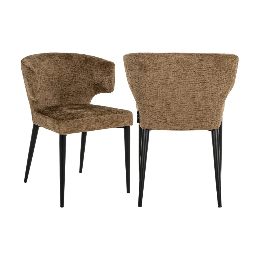 Supported by four sleek black metal legs, its design is highlighted by an elegantly curved backrest that not only enhances its visual appeal but also offers unparalleled comfort and support. Wrapped in luxurious brandy fusion fabric upholstery, it adds a touch of warmth and sophistication, complementing its modern aesthetic.