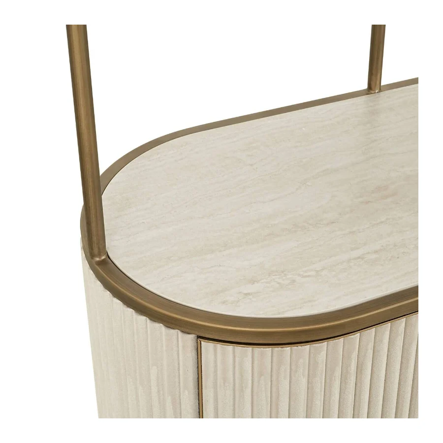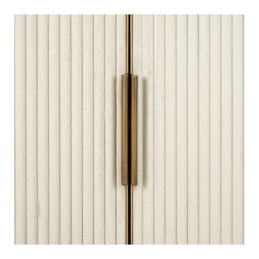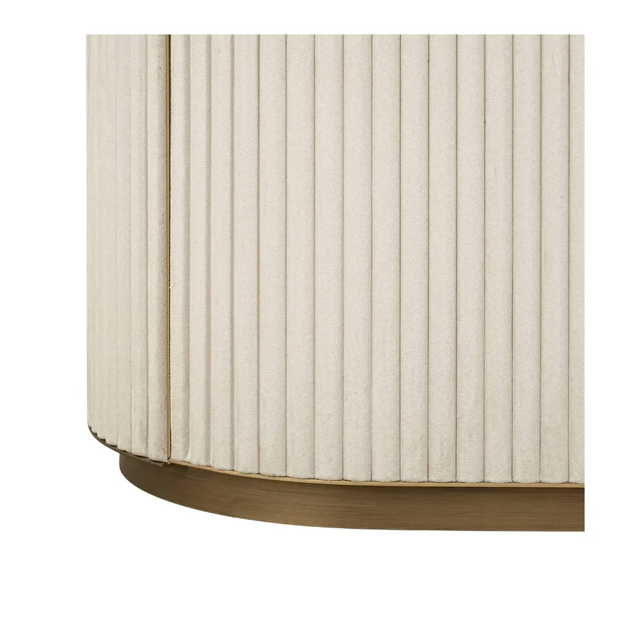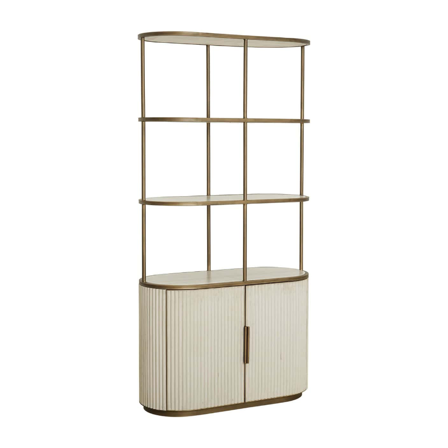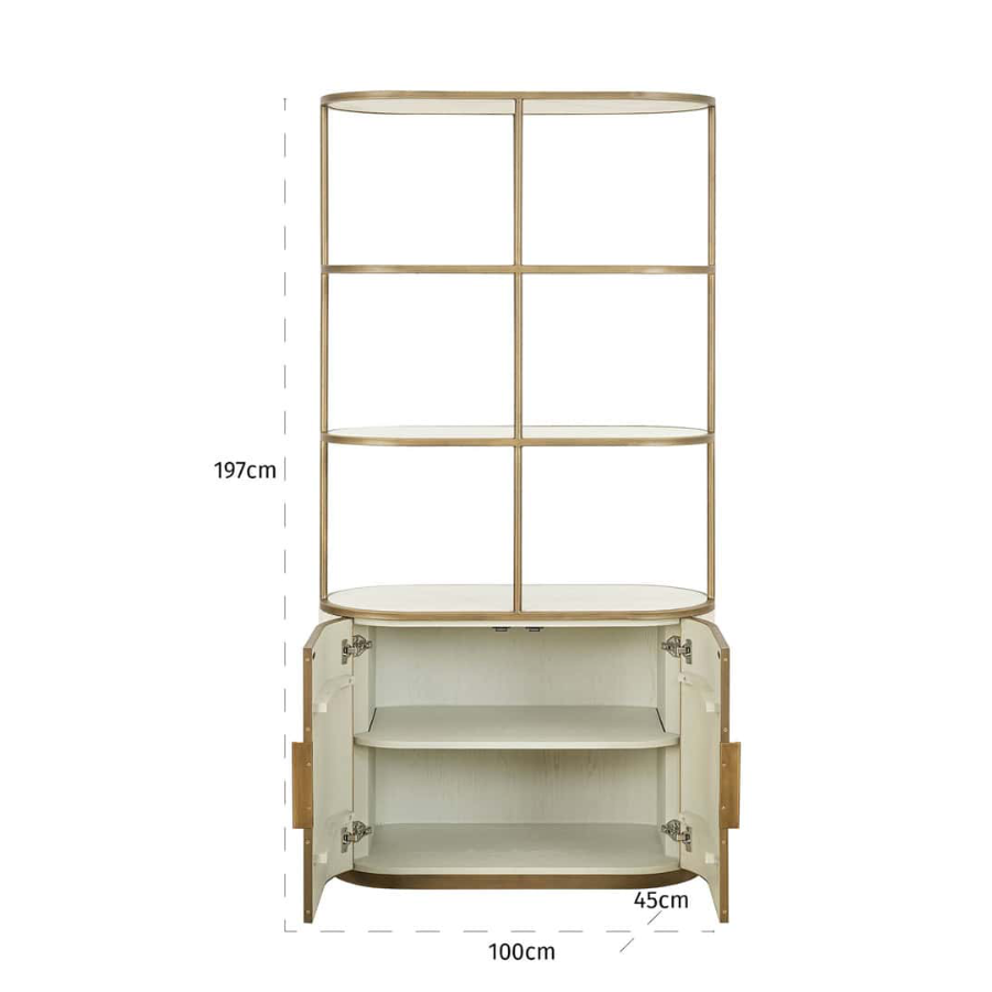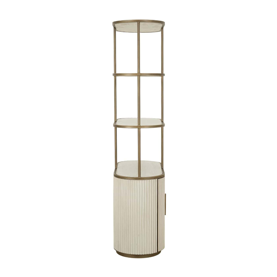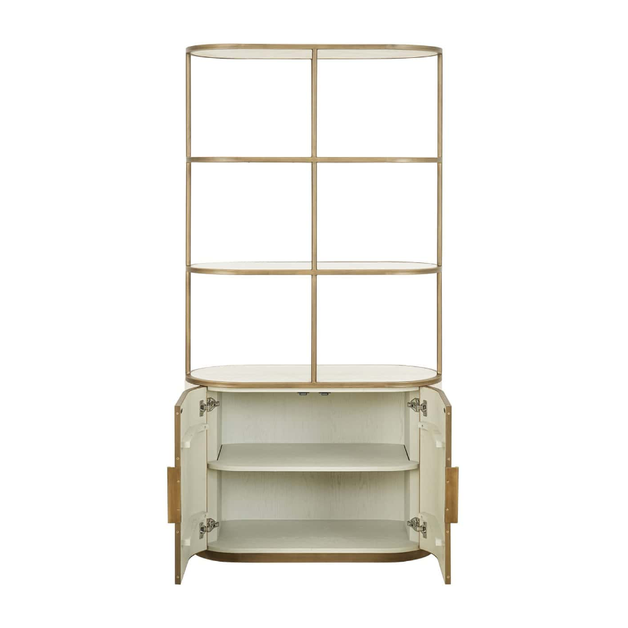 Crafted with a brass iron frame, this display cabinet exudes an airy, lightweight feel, while the ribbed white velvet base adds texture and elegance. Balancing style and practicality, it offers both open display space and concealed storage. The spacious ceramic shelves are perfect for showcasing decorative pieces, books, or plants, while the lower cabinet provides discreet storage for everyday essentials.