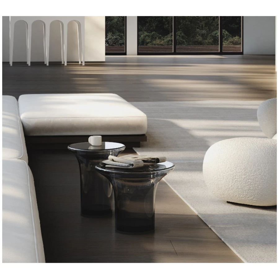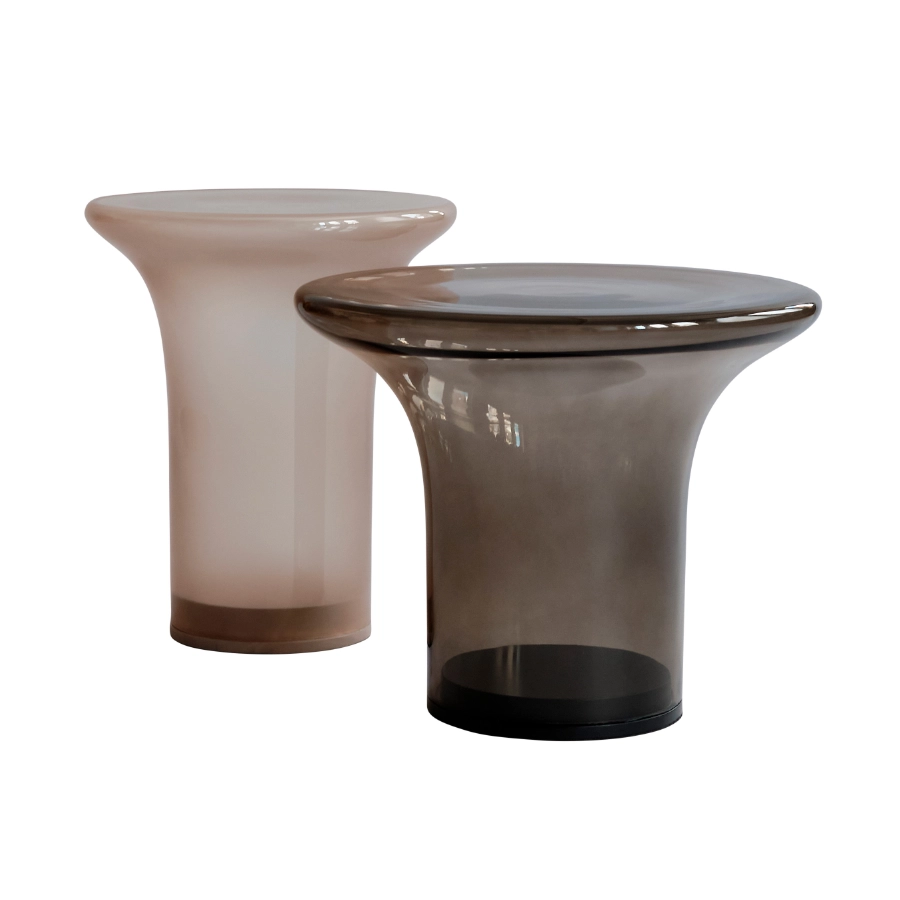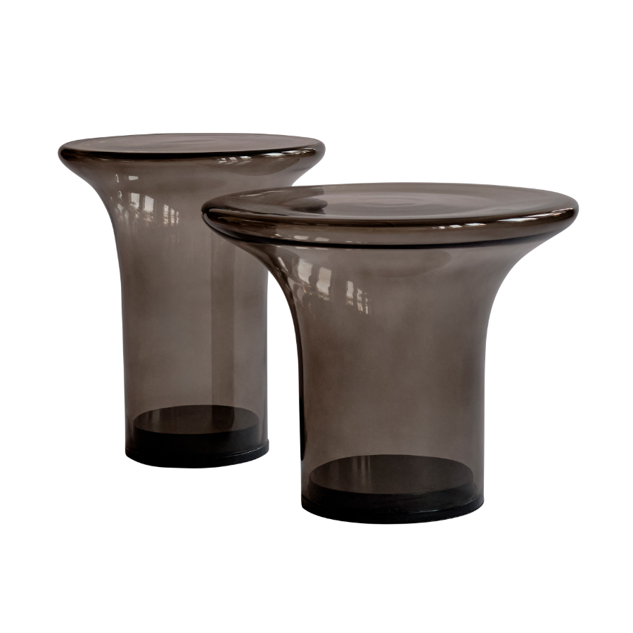 The Trumpet Table, inspired by the bold aesthetics of the 1970s, seamlessly blends clean geometric forms with a striking trumpet-shaped silhouette. Crafted entirely from glass, it features a smooth, circular tabletop balanced by an elegantly flared base, creating a sense of lightness and fluidity. The glossy surface subtly catches and reflects light, adding warmth and visual depth, making it an eye-catching statement piece in any space.