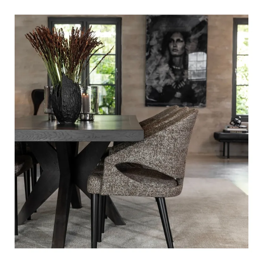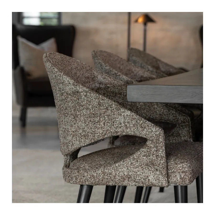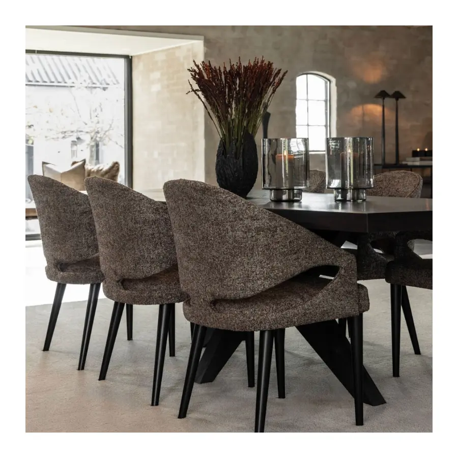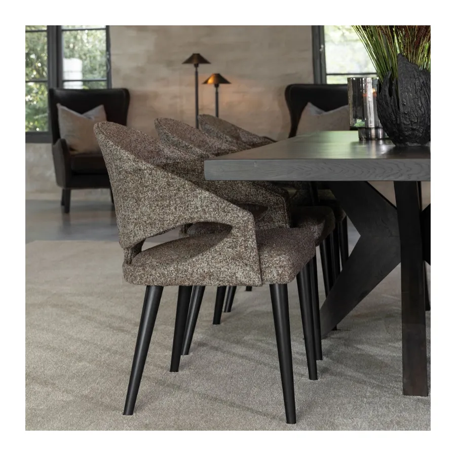 The fully upholstered style in soft fabric is paired with a curved backrest and open cut-out details, giving the chair both character and a sense of visual lightness. The slim, tapered wooden legs offer a refined contrast to the padded seat, contributing to an airy and well-balanced expression.