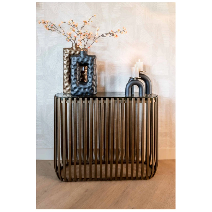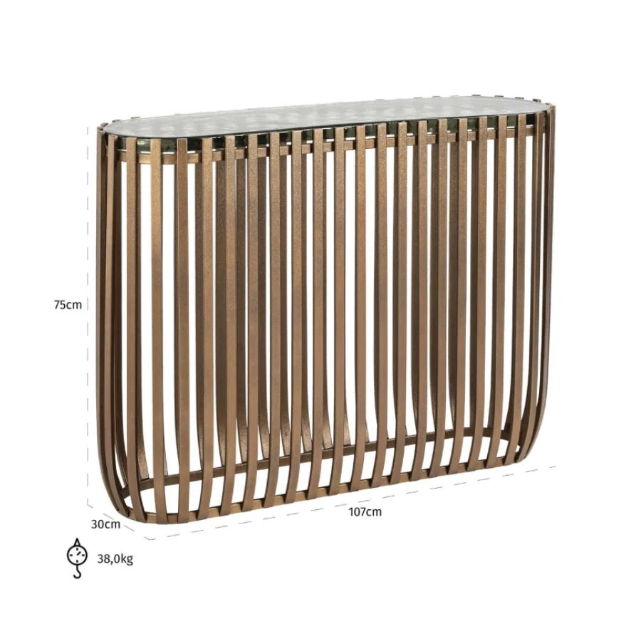An elegant wall table made of iron with a glass tabletop.