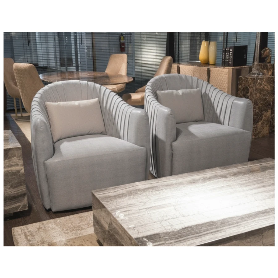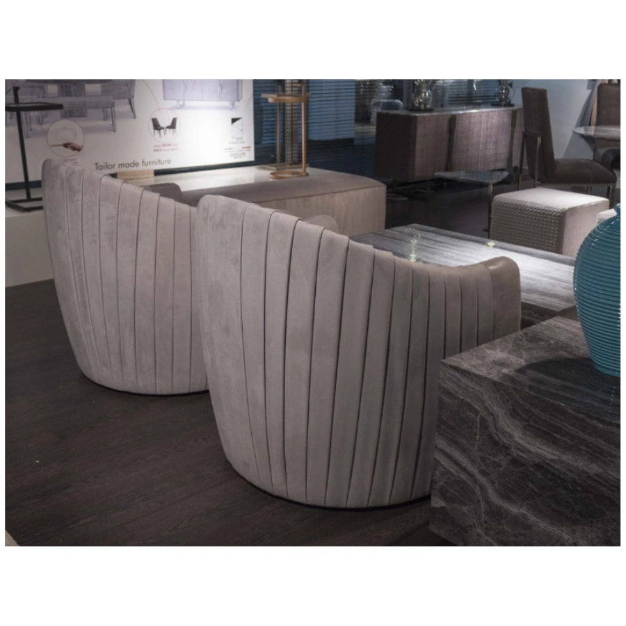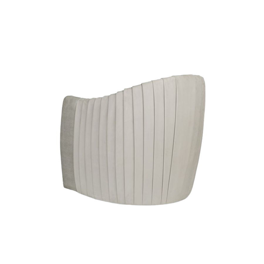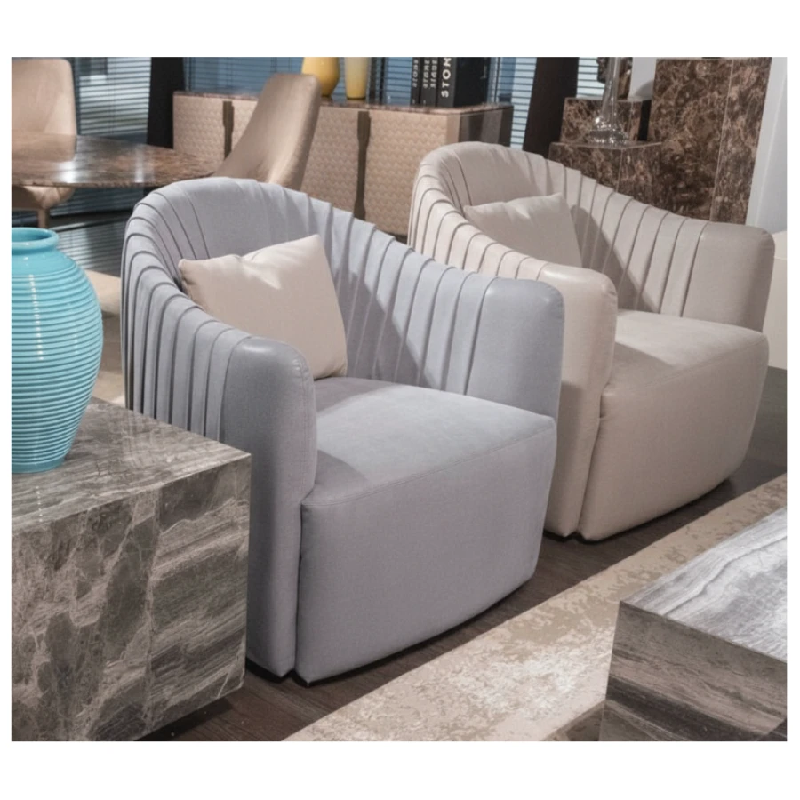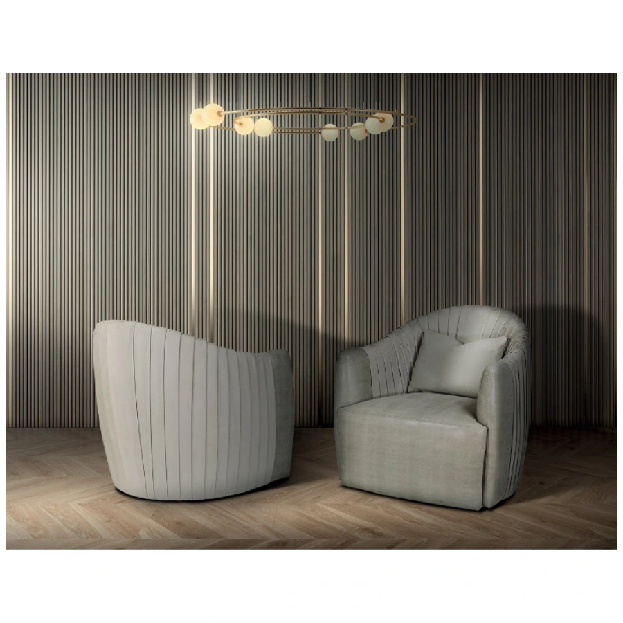 With a hidden swivel base, this armchair effortlessly combines visual gravitas with practical flexibility, allowing you to turn and engage with your space while maintaining a strong anchoring presence. Pleated detailing on the back ensures that the chair looks just as stunning from every angle—ideal for open-plan areas or luxurious lounging suites.