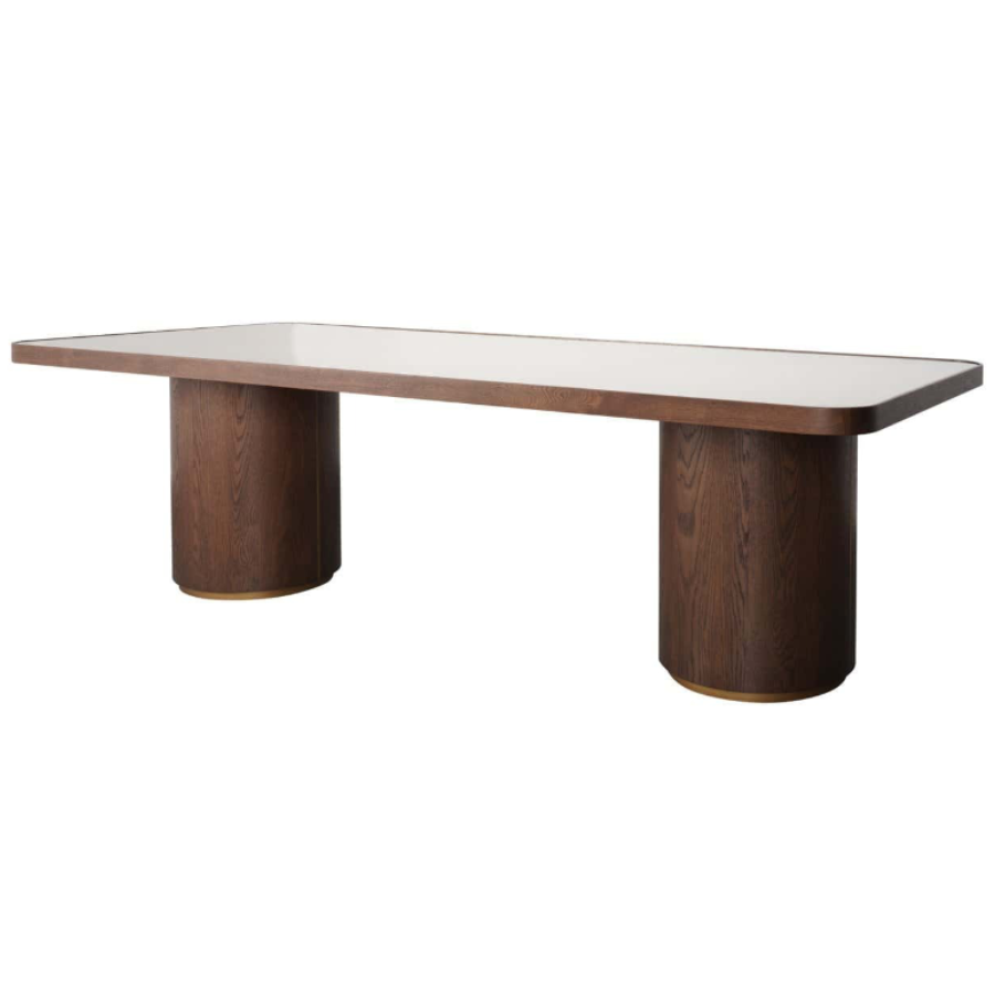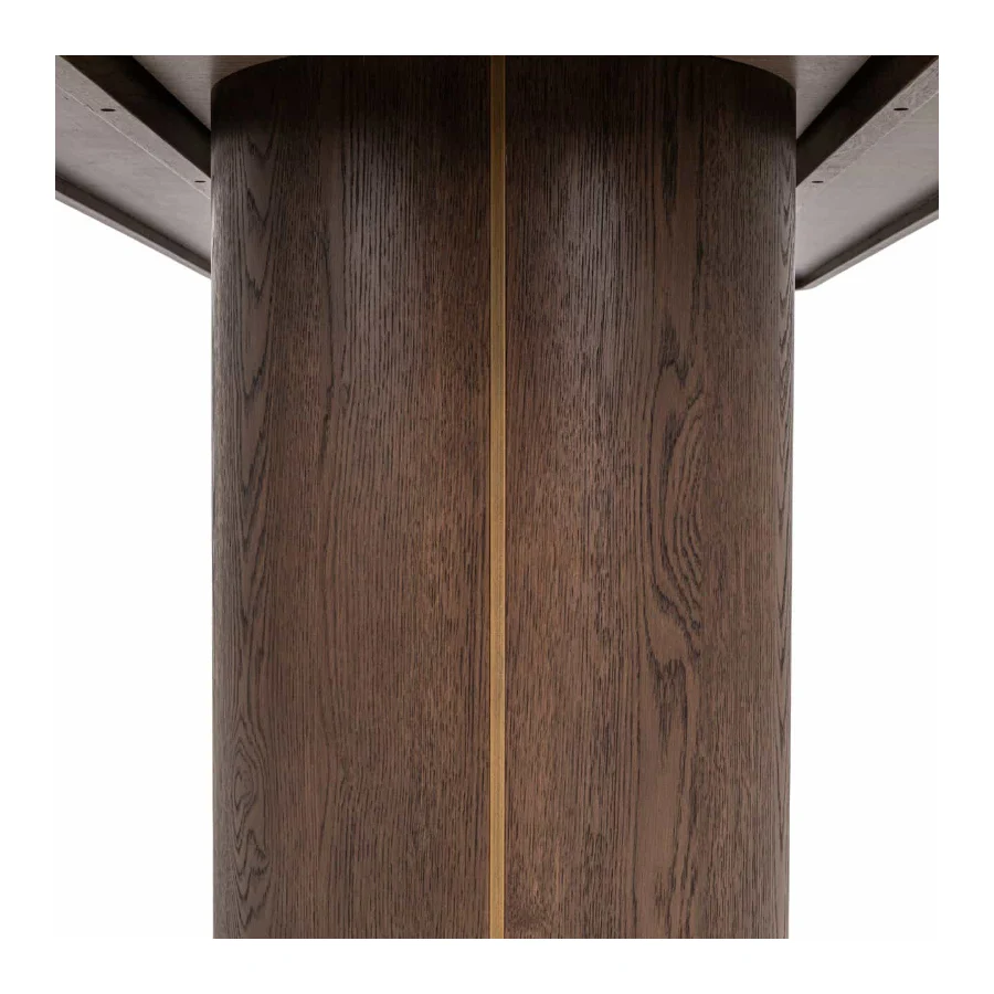 Its strong presence and warm finish create a striking yet versatile centerpiece for the dining room.